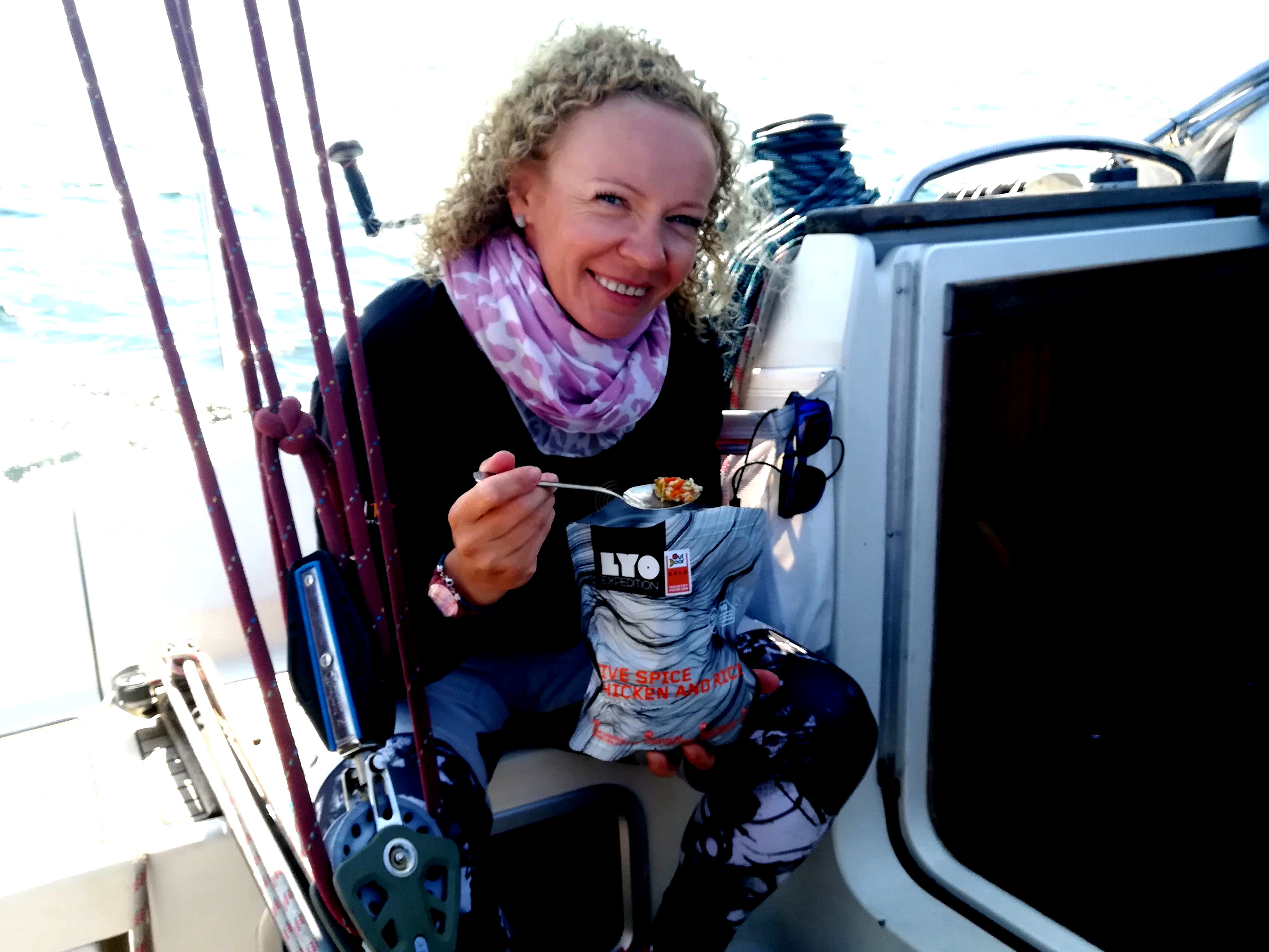 Na obiad kambuz dzisiaj serwuje kurczaka pięć smaków … w liofilizowanej formie. Pierwszy raz miałam przyjemność spróbować tego wynalazku i tak, przyznaję, była to przyjemność. Idealne rozwiązanie nie tylko dla żeglarzy. Otwieram torebkę, zalewam gorącą wodą, zamykam na 10 minut i można spożywać. Z reguły wszelka żywność wysokoprzetworzona, w formie instant smakuje jak chemiczny wiór, ale to danie jest całkiem smaczne,wyjątkowo praktyczne i najważniejsze - nie trzeba zmywać nadmiernej ilości naczyń, co zawsze jest upierdliwym obowiązkiem na jachcie.