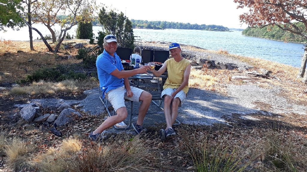Odległości jakie teraz będziemy pokonywać to kilka do maksimum kilkunastu mil, więc nigdzie nam się nie spieszy. I to właśnie lubię. Żadnej nerwówki. Nawet nie wiemy jak długo płyniemy. Dookoła tak piękne widoki, że do Arnö dopływamy dziwiąc się, że to już. Na skałach widać ucha cumownicze, ale dmuchając na zimne, wypuszczamy przodem Roberta, który ma sonar patrzący w przód. Suchą stopą jednak, nie da się tutaj zejść na ląd. Stajemy ze 2 metry przed skałą, ale przed dziobem jest wody tuż ponad kolana. Nie szukamy innego miejsca. Kotwice z rufy a cumy dziobowe na wyspę. Przydają się „kacze dzioby” – łatwiej zejść na ląd. Na wyspie żywego ducha – „najdziksza dzicz” – ale stoi tu podwójna sławojka. Jednak nie taka sławojka jak ta na Ruden, gdzie najodważniejsi boją się zaglądać. Ta sławojka jest jakby tu powiedzieć, pięciogwiazdkowa. Czysto, pachnąco a na ścianie wisi sobie biała rolka mięciutkiego papieru toaletowego. Za sławojką dwa pojemniki na śmieci. Sławojka została obfotografowana jako dowód dla niedowiarków, że tak można. Po paru godzinach, przypływa kilka motorówek, ale trzymają się zdala od nas, żeby sobie nie przeszkadzać. A po drugiej stronie wyspy, podpływa tubylczy jacht, który staje w takim miejscu, że cała czteroosobowa rodzina wychodzi po prostu z kosza dziobowego na skałę. Miejsce to, oczywiście, szybko zaznaczam na mapie. Pewnie się przyda jeszcze nie raz. Zwiedzać tu za dużo nie ma czego, więc oddajemy się typowym szkierowym przyjemnością. Grill, kąpiel, napoje, wygrzewanie się na skale, wzdychanie do pięknych widoków, przekąska, kąpiel, kilka fotek, napoje, wygrzewanie się na skale. I tak do wieczora.