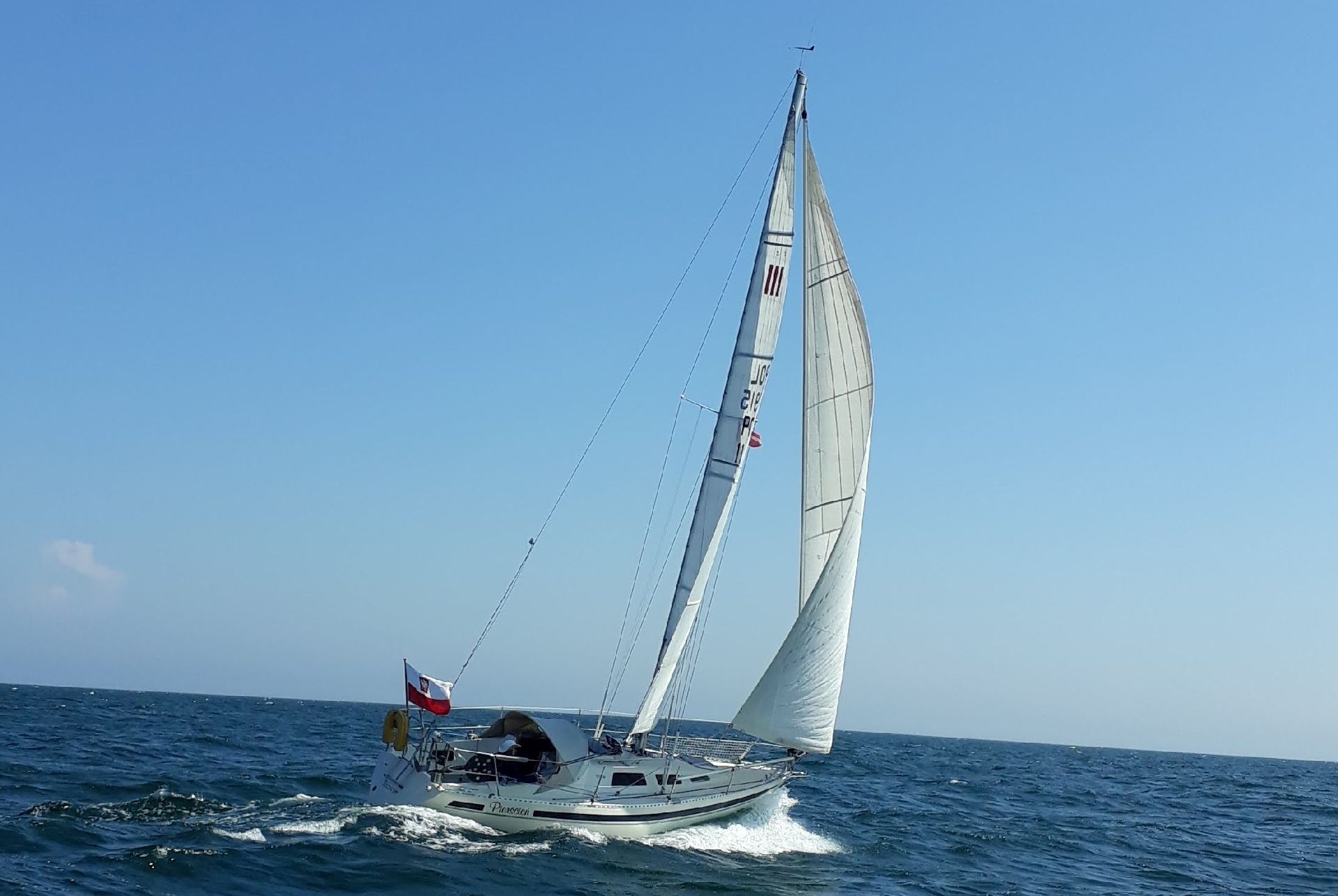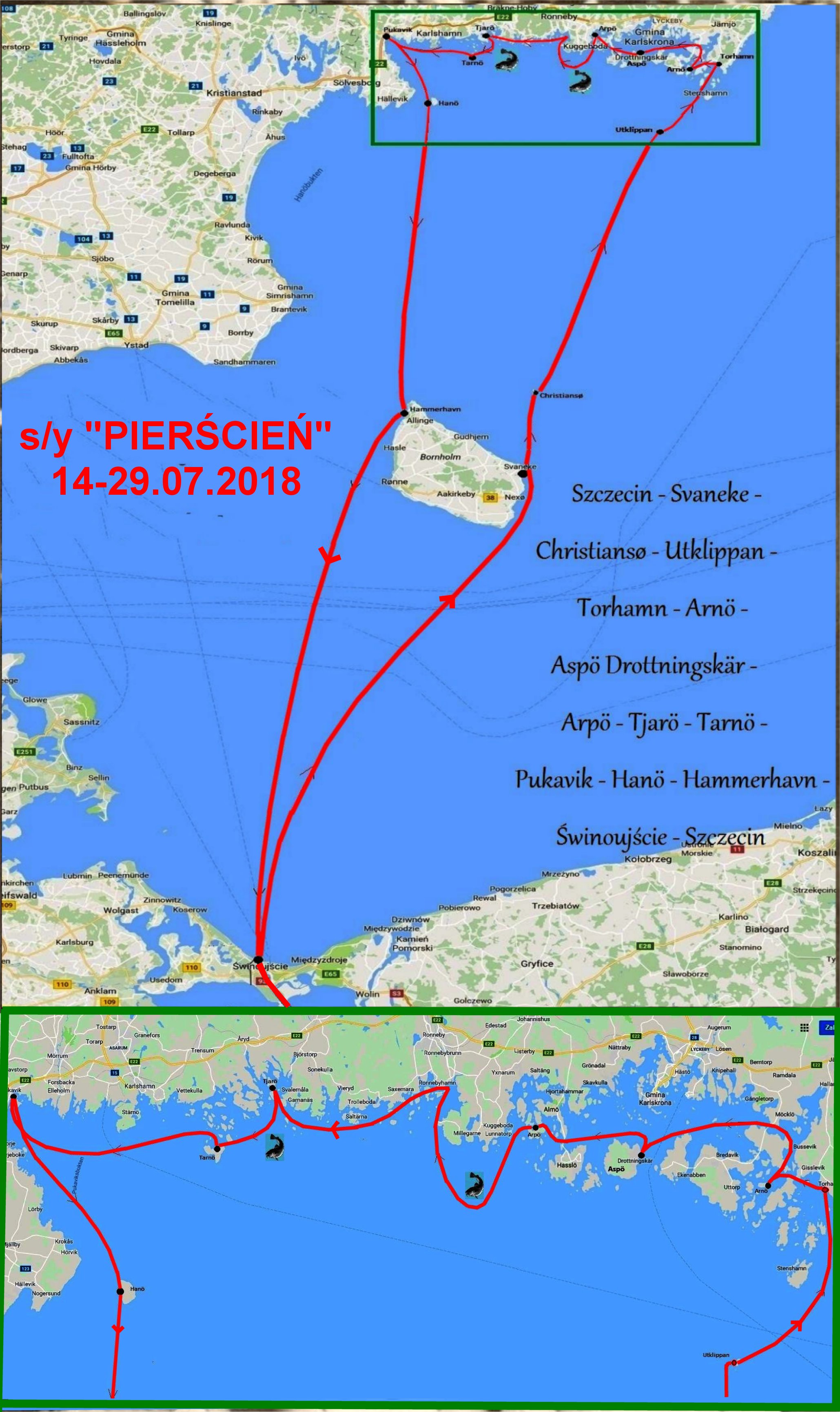 Start w sobotę 14 sierpnia 2018 o 9 rano. Pod wiatr, więc płyniemy na silnikach wspomagając się żaglami. Na ”Aspoletce” zamarudzili z wypłynięciem i umawiamy się, że dogonią nas w Świnoujściu.Zalew, przy wzmagającym się wietrze, udaje się przepłynąć 3 halsami i już o 17:00 jesteśmy w Basenie Północnym. Szybki obiad a ponieważ prognoza bardzo korzystna, wypływamy półwiatrem o 19:00 prosto w stronę Bornholmu. „Aspoletka”, płynąc kilka godzin później, ma na Zalewie już wiatr idealnie z NW czyli prosto w nos i to miejscami dochodzący do „siódemki”. W Świnoujściu są dopiero koło północy i decydują się podążać za nami dopiero rano.