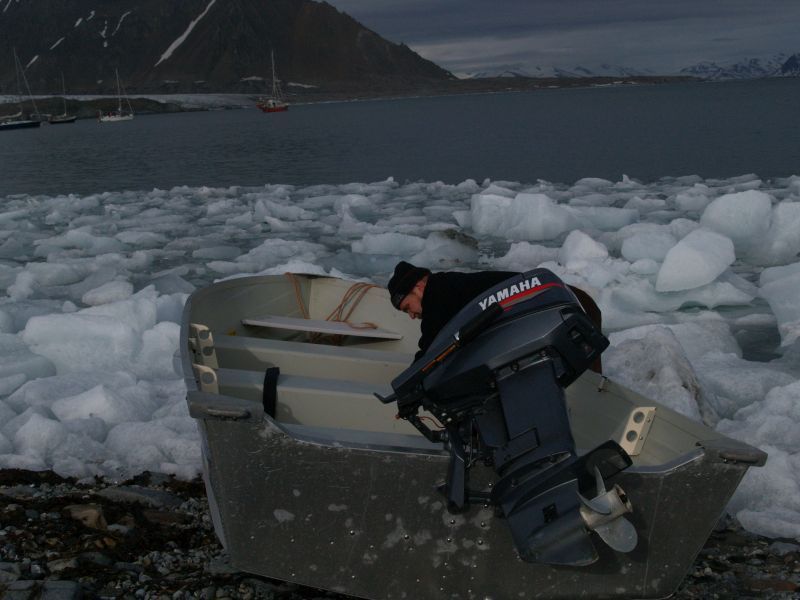 Antycypując, zrobiła się z tego osobna, wielodniowa i wielce dramatyczna epopeja, ale to rzecz na osobną historię. Na razie wędkarzy łatwośmy z głów wyrzucili. Gorszy był problem, bliższy w każdym razie, z paniami. Kapitan jachtu uznał, ze wobec sztormu i wobec braku możliwości bezpiecznego zakotwiczenia pójdzie te drobne sto mil do Longyearbyen, razem oczywiście z naszymi paniami. Panie na to w bek, że nie chcą, nie mówiąc już o kierowniku wyprawy, który codziennie zbierał przecież nasze podpisy na liście obecności. W końcu byłaby to nie usprawiedliwiona nieobecność w pracy. Bóg wie na jak długo, bowiem okazyjny powrót był nie do określenia. Ani co do czasu, ani co do ceny. Zatem cała nadzieja we mnie, że zdejmę panie z jachtu, odejdę na tym dwumetrowym przyboju od brzegu i potem na nim, cało wyląduję. Samo przejście z jachtu na łódź, wobec problemów na plaży nie wydawała się jakimś wielkim wyczynem. Rzecz była w tym, że żadnej z łodzi nie byliśmy w stanie utrzymać przy plaży na tyle długo, by do niej wskoczyć, uruchomić silnik i odpłynąć. Nie dość że fala, to jeszcze brzeg był zasypany growlerami wielkości małej ciężarówki. Żadnej, oprócz jednej, ukraińskiej budowy aluminiaka. Była to bardzo lekka łódź, którą, w stanie wyższej konieczności mogliśmy przenieść we dwu. Z odpowiednio lekkim silnikiem, we trzech. Akurat tydzień wcześniej rozpakowałem nówkę, dwusuwową piątkę Yamahy, pod którą ta leciutka łódka chodziła w ślizgu. Po gładkiej wodzie oczywiście i tylko ze sternikiem, niemniej jednak. Normalnie zakładałem do niej dwadzieścia koni na długiej kolumnie i z tym szła w ślizgu jak przecinak, niezależnie od stanu morza. Ale dwadzieścia koni swoje ważyło i nie było mowy byśmy z ciężkim silnikiem mogli zejść na wodę tak szybko jak tego wymagała sytuacja.