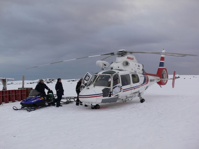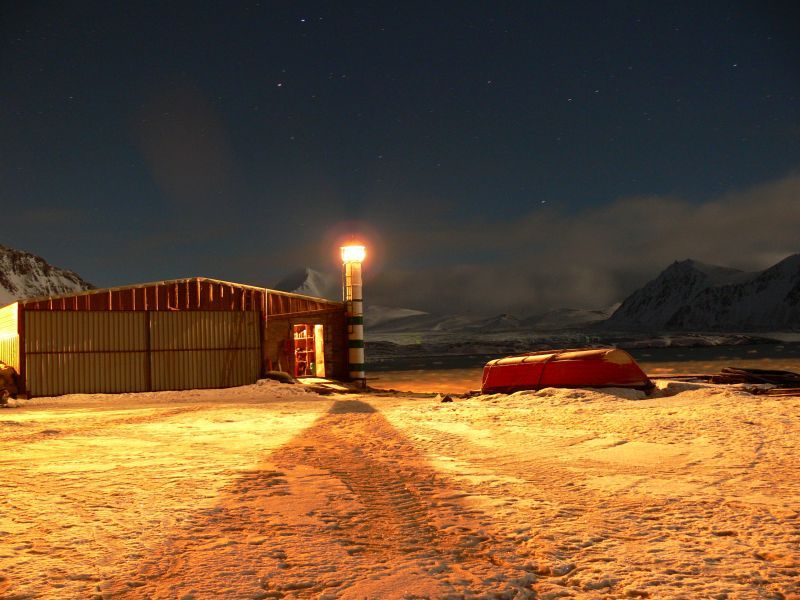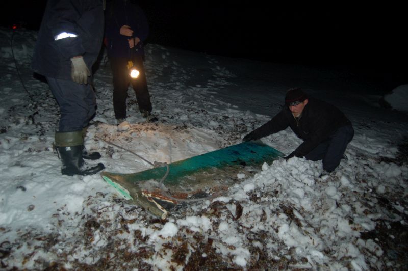 Nie da rady, zatem po naradzie ;-) wołamy przez radio następnego do pomocy, razem ze skuterem śnieżnym i jeszcze jedną liną, bo pod sam brzeg skuterem nie da się podjechać, jest odpływ, kawał kamienistej plaży zalodzony ale bez śniegu, kamienny wał na najwyższej linii przypływu. Dało się ale łatwo nie było, czerń się już zrobiła głęboka, tylko te falujące zielenią festony na niebie, bez Księżyca, efektowne ale światła z tego tyle co nic.
