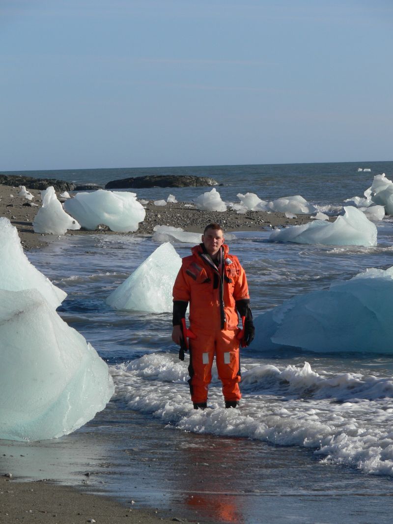 Zatem leciutka piątka, z pięciolitrowym baniaczkiem mieszanki, wbijamy się we trzech w kombinezony by dać sobie jakąś szansę w tej zlodowaciałej wodzie i... naprzód. Dwu na rufie, jeden na dziobie, czekamy na brzegu kiedy się grzywacz złamie i morze zacznie się cofać. Biegniemy za wodą po osuszającym się strandzie i w chwili kiedy następna fala zaczyna przed nami rosnąć jesteśmy już dobre kilkadziesiąt metrów w morzu. Najpierw zalewa tego z dziobem, wyciąga w górę ręce, tak by nie zalało nam wnętrza łodzi, ginie w biało niebieskiej wodzie razem z kapturem, w dwie sekundy, niecałe chyba, potem obaj na rufie odbijamy się od dna i wskakujemy na burtę. Kolumnę silniczka miałem już opuszczona i zatrzaśniętą. Ciągnę za sznurek rozrusznika, jeżeli nie odpali to po następnych kilku sekundach będziemy z powrotem na brzegu. Następny wał wody nas zroluje, zaleje łódź i może rzucić na którąś z tych lodowych, sterczących na brzegu górek.