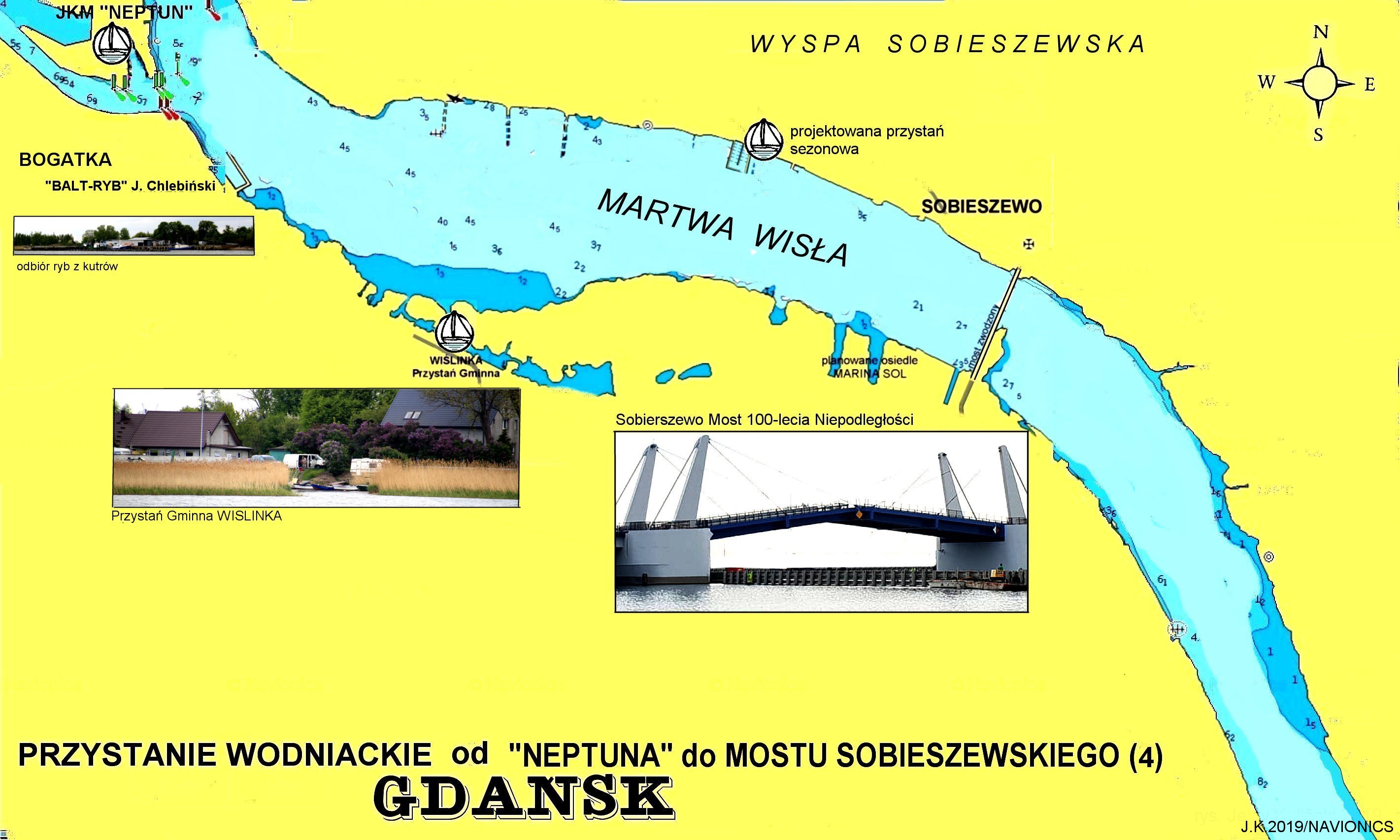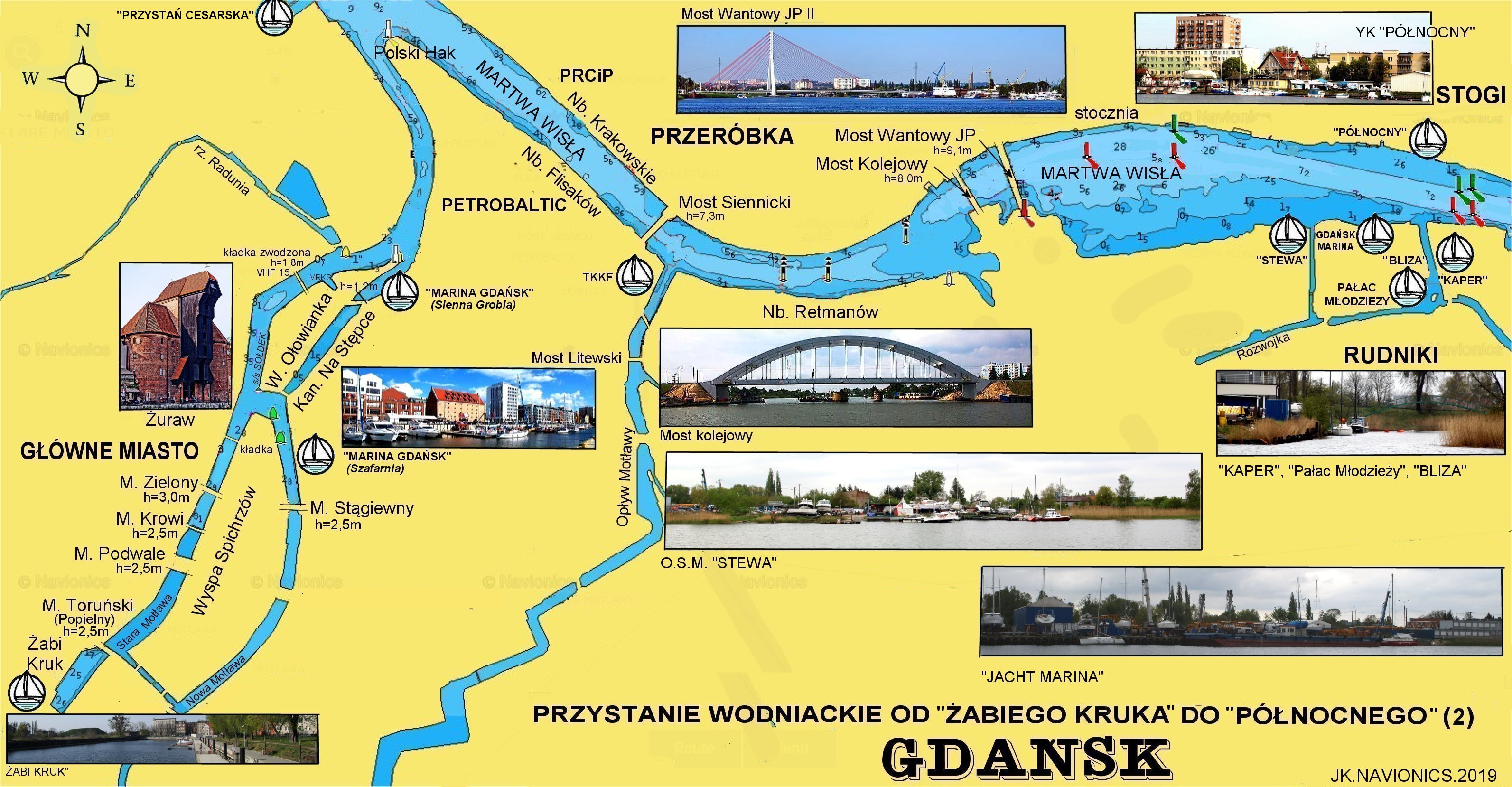 Do przystani tych prowadzą dwa podejścia: przez Nowy Port kanałem portu handlowego do centrum miasta oraz przez ujście Wisły Śmiałej na rozlewisko Przełomu i Martwej Wisły. Oba te rejony oddzielają (dla jachtów żaglowych) trzy mosty stałe: Most Tysiąclecia im Jana Pawła II (Wantowy), Most Kolejowy oraz Most Siennicki. Rejon Motławy dzieli zwodzona kładka dla pieszych – łącząca miasto z Wyspą Ołowianką. W samym mieście Gdańsk stałych mostów jest wiele: Zielony, Stągiewny, Krowi, Toruński, dwa mosty Podwale Przedmiejskie, Kamieniarski. Wszystkie kiedyś były zwodzone. Jaki by tego było jeszcze za mało – obecnie budowana jest kładka w osi ulicy Św, Ducha dla pieszych – łącząca Długie Pobrzeże z Wyspą Spichrzów. Do miejskich mostów na upartego można zaliczyć zwodzony Most Sobieszewski.
