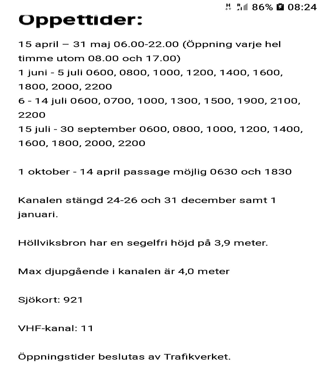 Ważna, jeszcze w tym sezonie aktualność, to godziny otwarcia mostu. Zamieszczam zrzut ze strony szwedzkiej. Z moich krótkich obserwacji wynika, że godziny otwarcia są przestrzegane akuratnie. W dwóch miejscach godziny są wyświetlane, więc można je zweryfikować na miejscu.