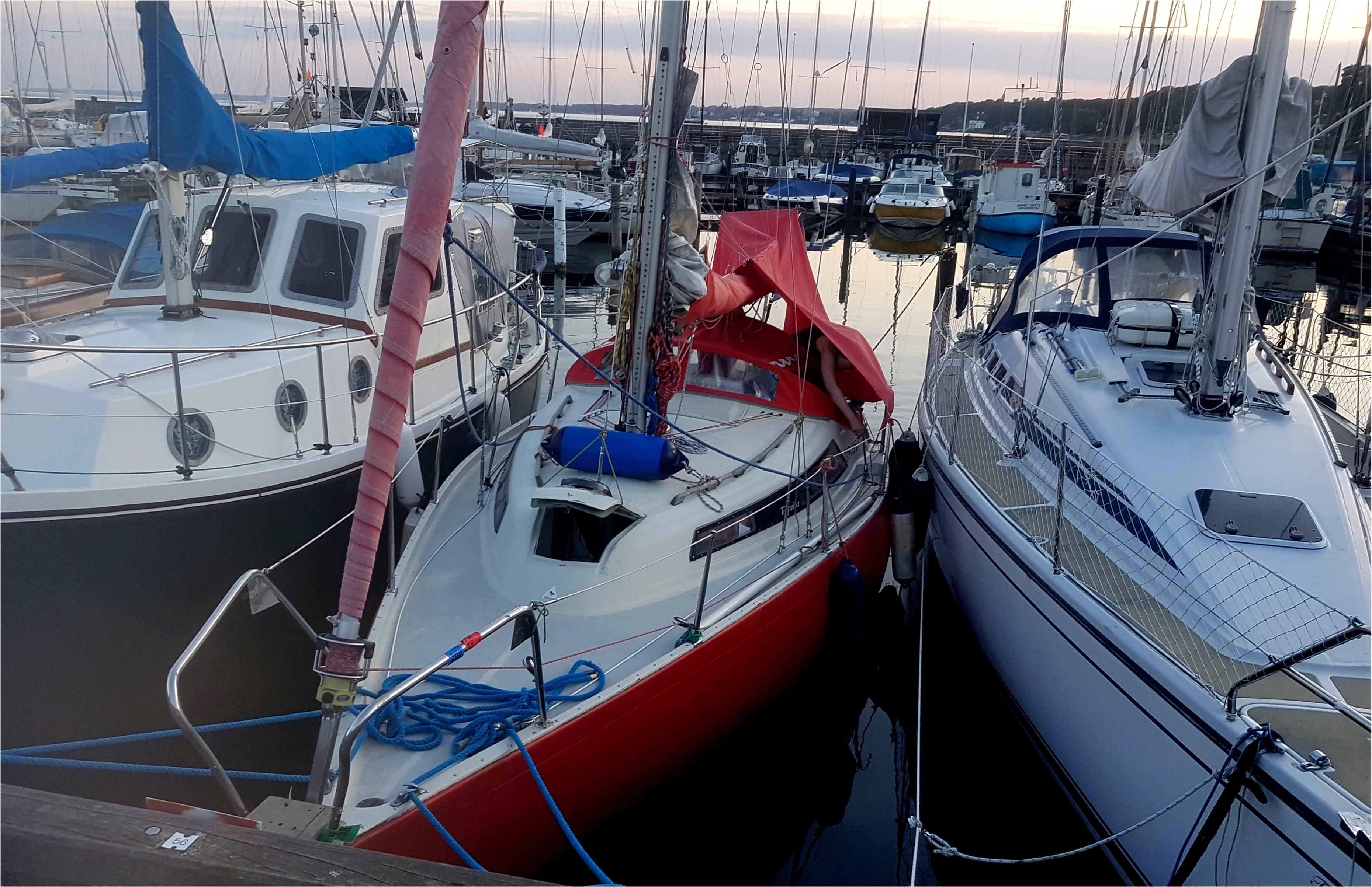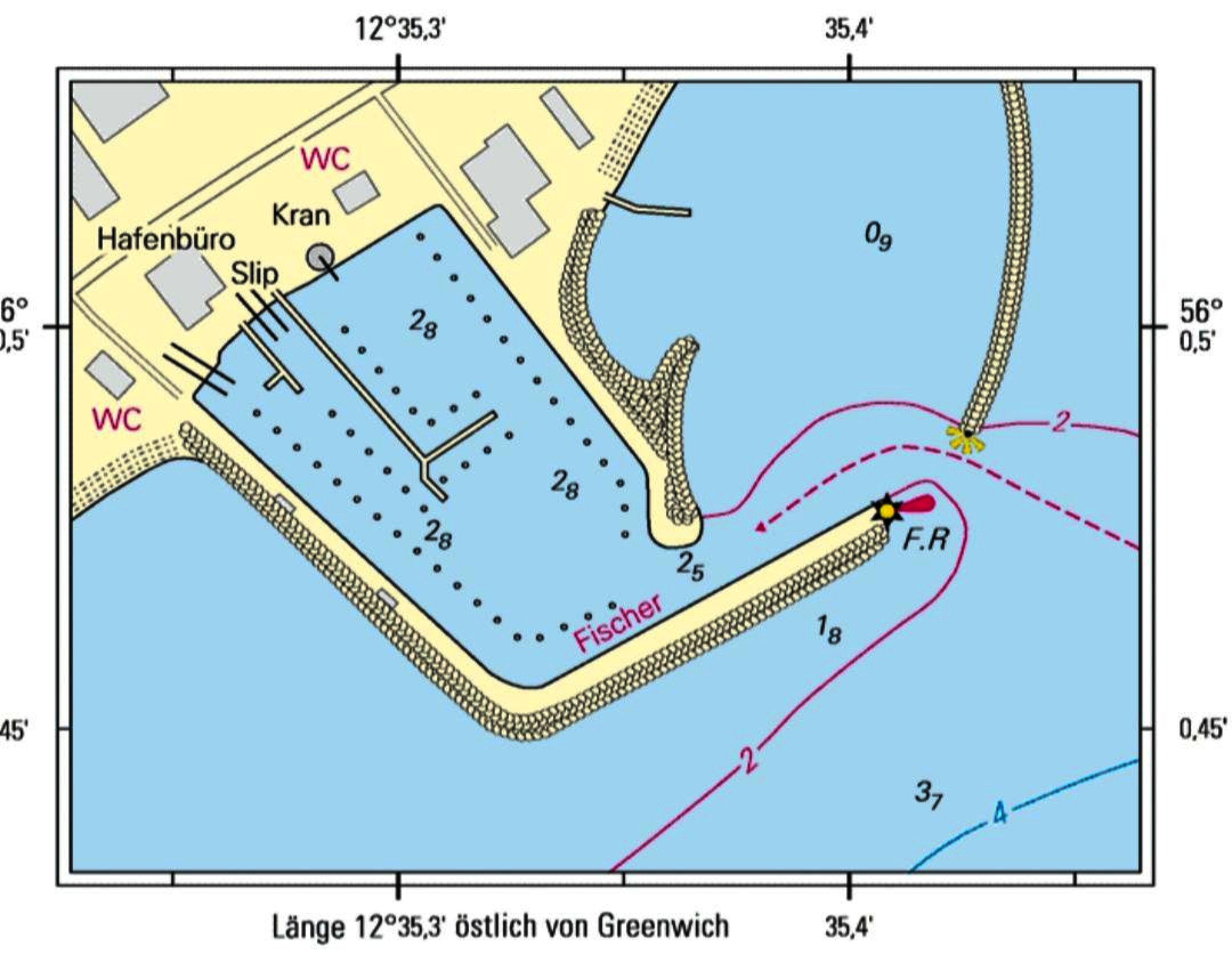 Zielona tyczkowa pława tuż przed główkami wydaje się zbędna. W nocy oświetlona jest tylko lewa główka. Zaraz za nią trzeba skręcić wzdłuż falochronu w lewo. Miejsca szukałbym przy wewnętrznym pirsie w prawo od pochylni, południowy basenik jest skrajnie ciasny. Zajrzałem tam najpierw i potem musiałem zawrócić mając około 11 metrów między silnikami zaparkowanych motorówek.