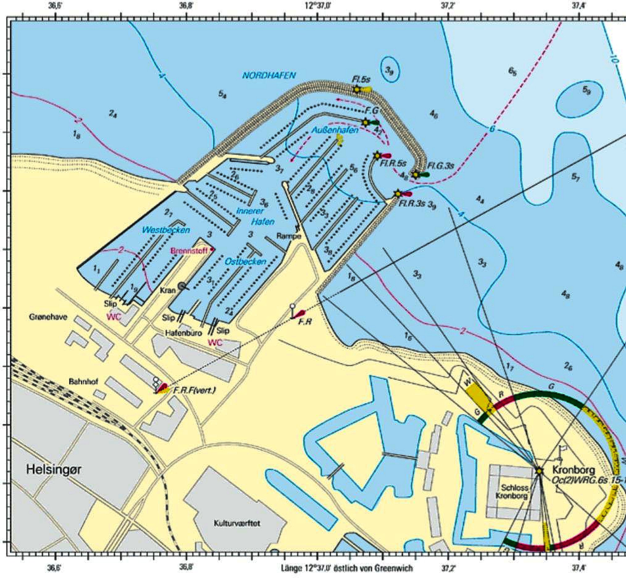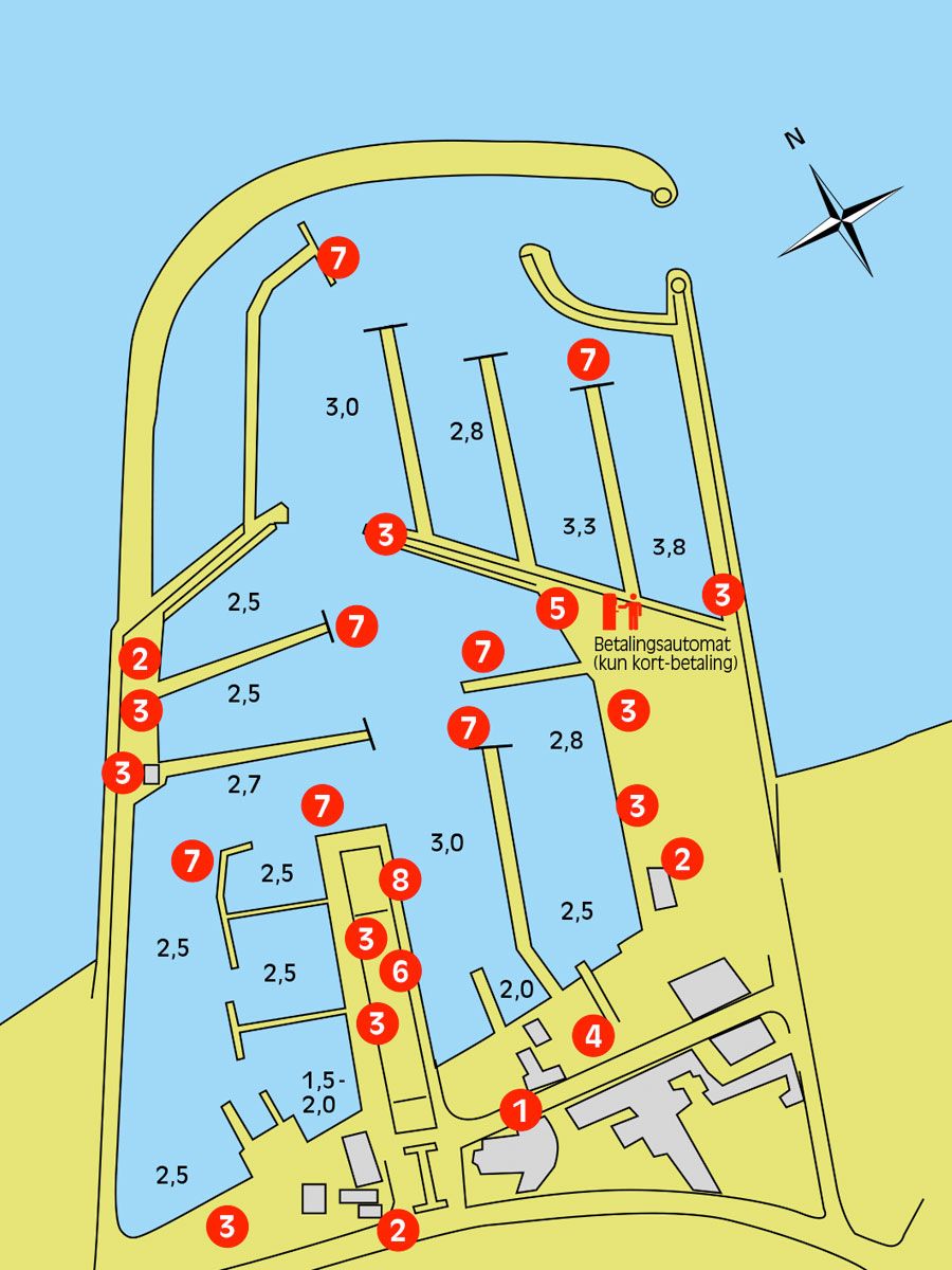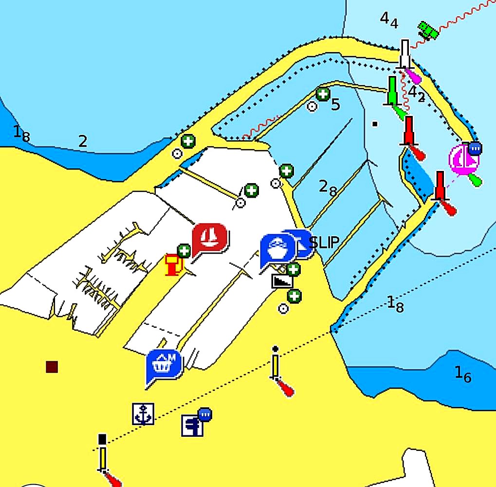 Układ portu sie nie zmienił, przybylo trochę stanowisk postojowych. Najważniejszą nowością jest przedłużony pomost wzdłuż północnego falochronu, dedykowany dużym jachtom. Niemieckie źródło podaje, że postój tam wymaga uzgodnienia z hafrneistrem. Problem w tym, że komunikujemy się wyłącznie z parkometrem, uwaga: nie przyjmuje gotówki.