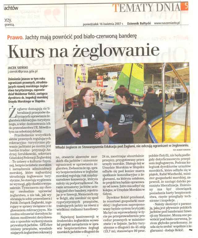 Dziś w "Dzienniku Bałtyckim" mamy artykuł Jacka Sieńskiego "Kurs na żeglowanie - jachty mają powrócić pod biało-czerwoną banderę". Autor pisze" Tymczasem my chcemy swobodnie uprawiać żeglarstwo, a nie tak, jak to sobie wyobrażają prawodawca i Polski Związek Żeglarski, ingerujący w sprawy zwiazane z żeglarstwem rekreacyjnym". No tak - nieboszczyk Ludwik Szwykowskl ze wstydem patrzy z góry, co też wyrabia Jego następca.