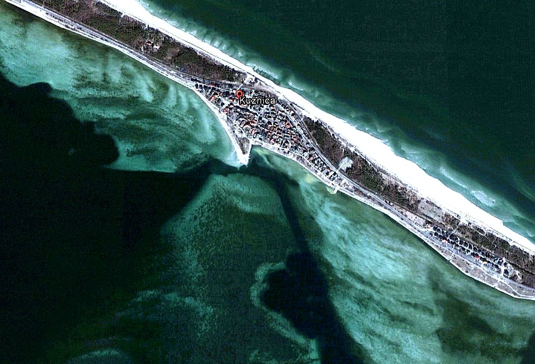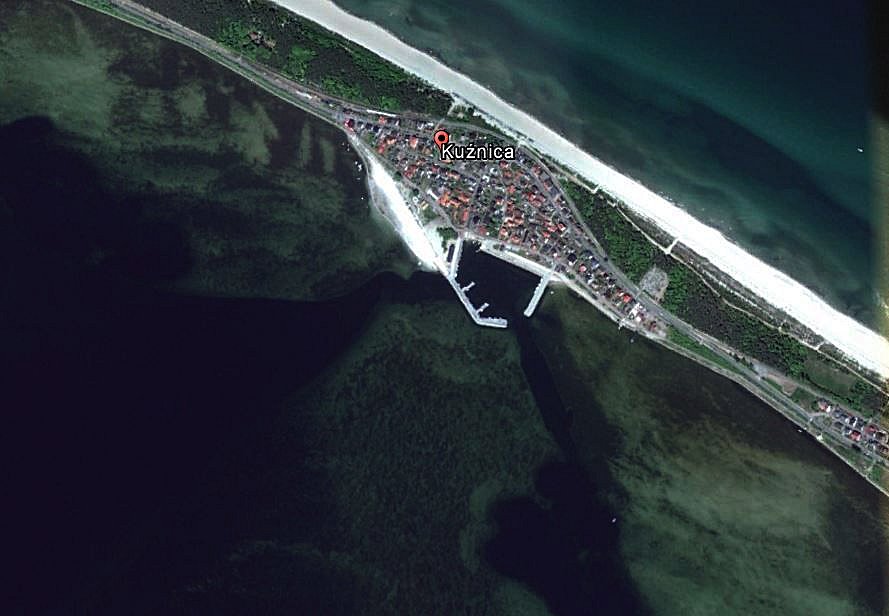 Cofamy się w czasie. Kilkaset lat temu Kuźnica leżała na wyspie! Stąd jej kaszubska nazwa: Kusfeld, co dosłownie znaczy „miejsce pocałunku”. W cieśninach oddzielających ją od sąsiedniego lądu „całowało się” Wielkie Morze z Małym Morzem. Prowadziło tamtędy przyjście z Pucka na Bałtyk.