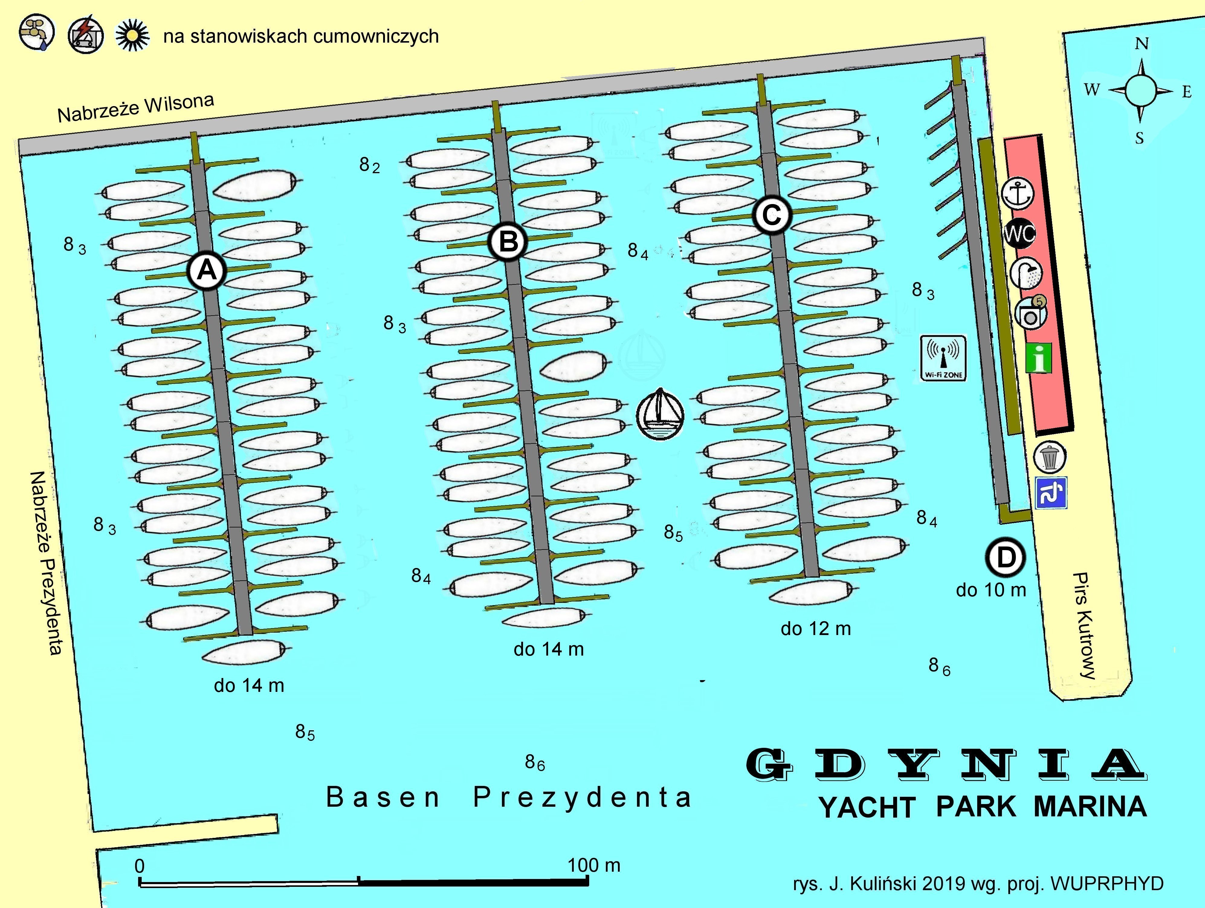 Dziś prezentuję planik przystani o nazwie YACHT PARK MARINA. Dwuznacznie zapisana intencja – park, czy parking. Myślę, że to lokalizacja tymczasowa, bo szkoda marnować basen portowy o głębokości 8 metrów, podczas gdy jachty z powodzeniem by się zadowoliły głębokościami rzędu 3,5 m. Gdyński Basen Prezydenta zasługuje na wizyty statków wycieczkowych, pasażerskich, spływów żaglowców czy kurtuazyjnych odwiedzin popielatych niszczycieli, korwet czy fregat flot wojennych zaprzyjaźnionych państw – dla uświetniania miejscowe uroczystości. Ale to sprawa gdynian. Na razie niech się cieszą żeglarze.