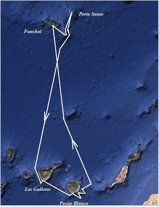 W niedzielę o 1240 zegnamy gościnna marinę i przy lekkim południowo wschodnim wietrze kierujemy się w drogę powrotną. Nie udaje się nam jednym halsem ominąć długiej kosy wysp z Ilha Deserta Grande ale zamiast przy słabym wietrze halsować, zwijamy fok i na „dizelgrocie” suniemy prosto na południe aż do minięcia Ponta de Agulhia na którym jednak oznaczona na mojej mapie latarnia nie świeci. Wracamy do żeglarstwa. Wiatr słabnie i o 0150 w poniedziałek trzeba się przeprosić z motorkiem. Rano wraca wiatr z SSE. Zgodnie z prognozą, powyżej kanarów czeka nas żwawy przeciąg. Pod wieczór rolujemy grot do połowy. Rano we wtorek wiatr rośnie do 20 – 27 kn. Fala rośnie a lekka łódka zachowuje się zupełnie niepoważnie. Skacze z hukiem po falach i wydaje dźwięki sugerujące jej bliskie zniszczenie. Nie daję się na to nabrać ale koło 1300 sprzątamy ostatecznie grota a i fok conieco rolujemy by jej ulżyć. Wiatromierz pokazuje chwilami 35 kn. Nad morzem mgiełka która nie pozwala zobaczyć świateł Teneryfy. To znaczy, wszyscy, zachęceni obiecana nagrodą widza w oczekiwanym kierunku mnóstwo przeróżnych świateł tylko ja mam widocznie już słaby wzrok. Wiatr powoli słabnie a my wchodzimy w cień Teneryfy gdzie fala się uspokaja a i wiatru nie wystarcza do żeglugi. Znowu motorek. Wreszcie w środę o 0930 cumujemy w Marina del Sur w Las Galletas na pd krańcu Teneryfy.