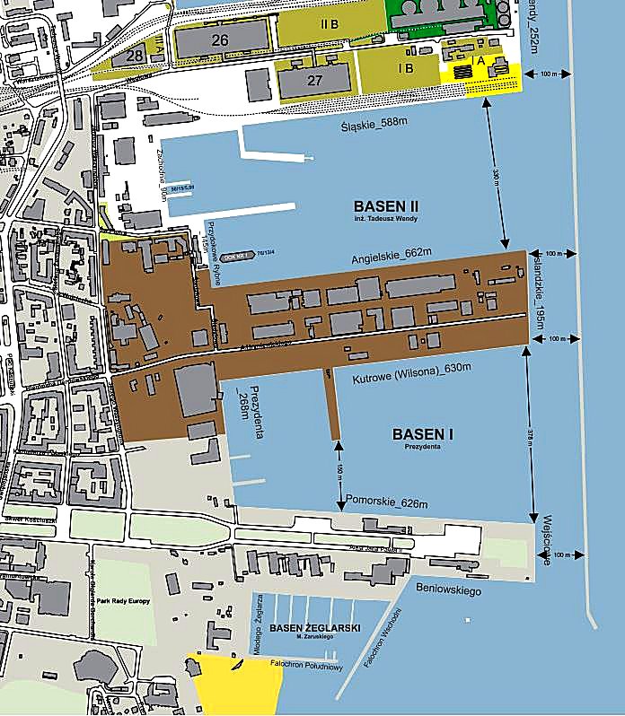 Basen Wendy, za wyjątkiem Nabrzeża Śląskiego, będzie portem jachtowym. Sytuacja jest wyjątkowo korzystna – wzdłuż Nabrzeża Angielskiego da się zmieścić sporą marinę. Natomiast tereny po przeniesionej Stoczni „Nauta” (biały obszar na planie) staną się zapleczem warsztatowo-stoczniowym i zimowiskiem jachtów.