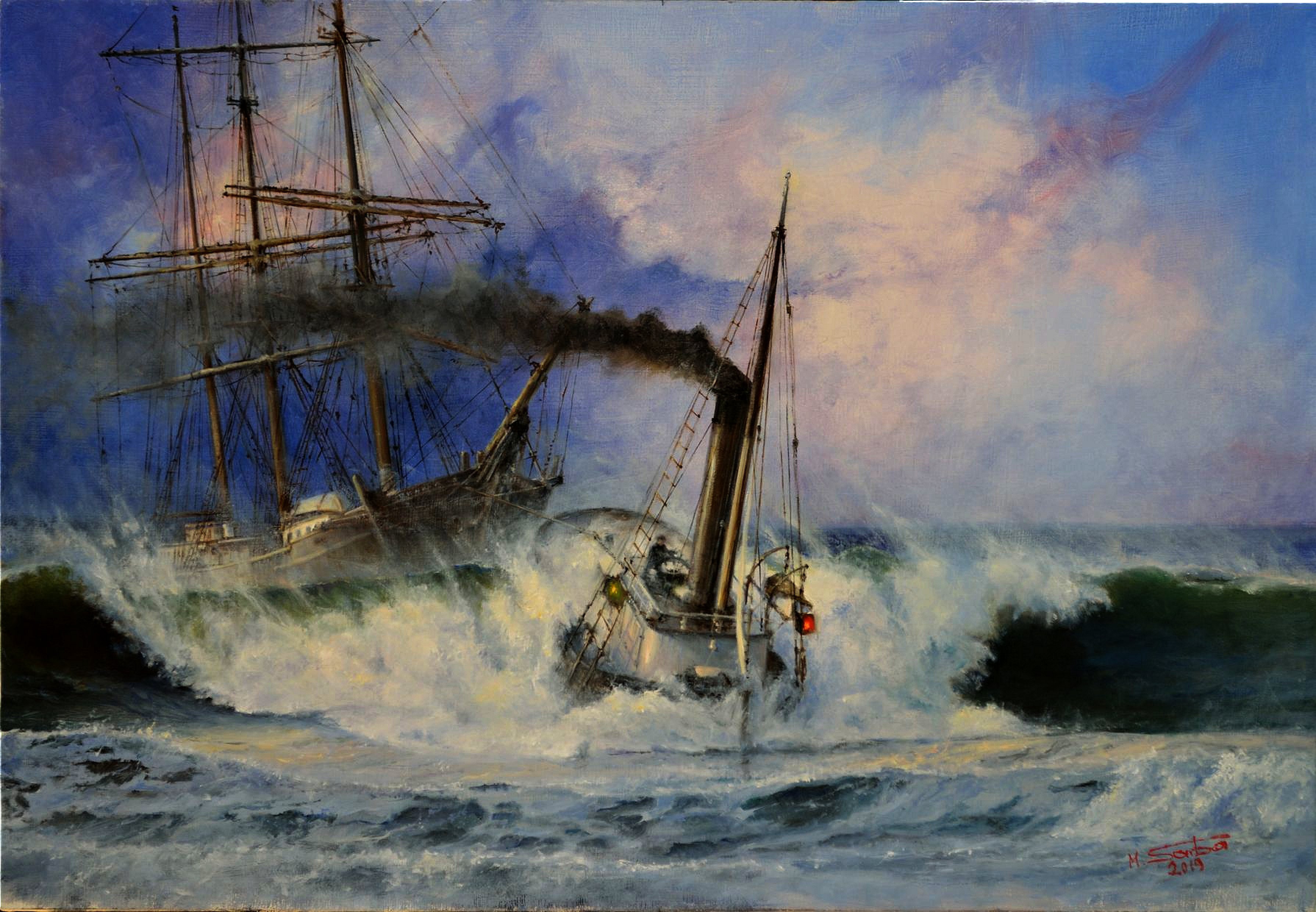 Obraz przedstawia moment przeprowadzania statku zaglowego poprzez parowy holownik pod koniec lat 1800. Prosze zwrocic uwage na holownik. Byly to specjalnie budowany holowniki do tej pracy. Nie ma sterowki a szyper stoi na stanowisku z kolem sterowym za kominem. Forma nizszego miejsca wycietego ponad maszynownia na koncu nadbudowki. Komunikacja z mechanikiem w tamtym czasie byla rura glosowa.