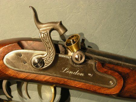 archaicznego dwulufowego (tzn. dwuosobowego) pistoletu, zachwyt nad poręcznością hebanowej rękojeści, gwintowanej lufy,