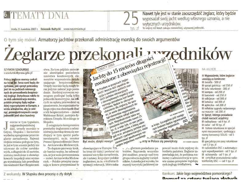 No cóż - na Sejmiku "dozorcy techniczni" będą prawdopodobnie robili dobrą minę do totalnej klęsk swojej spółdzielni z o.o. Jeden z "dozorców", ten najważniejszy oswiadczył nawet w Słupsku, że oni o liberalizację walczą jak lwy od dwudziestu lat. Ja to nazywam po imieniu - bezgraniczna bezczelność ! Oczywiście ojców sukcesów zawsze jest wielu, ale chciałbym tą listę już zamknąć w tej chwili: SAMOSTER, BRYFOK, PFŻ, SAJ i Gdańska Federacja Żeglarska. Nikt się do tej grupy niech nie śmie się doklejać. W staraniach o liberalizacje napotkaliśmy wyjątkowego sprzymierzeńca - oficera marynarki handlowej, z-cę Dyrektora Urzedu Morskiego w Słupsku - p. Waldemara Rekścia. Otrzymaliśmy wsparcie mediów Wybrzeza i miesięcznika ŻAGLE. Przekonaliśmy marynarzy - wysokich urzędników administracji morskiej. Nie daliśmy się PZŻ-towi. I to jest konkret. Tylko bez zakusów kooptacji do tej listy.