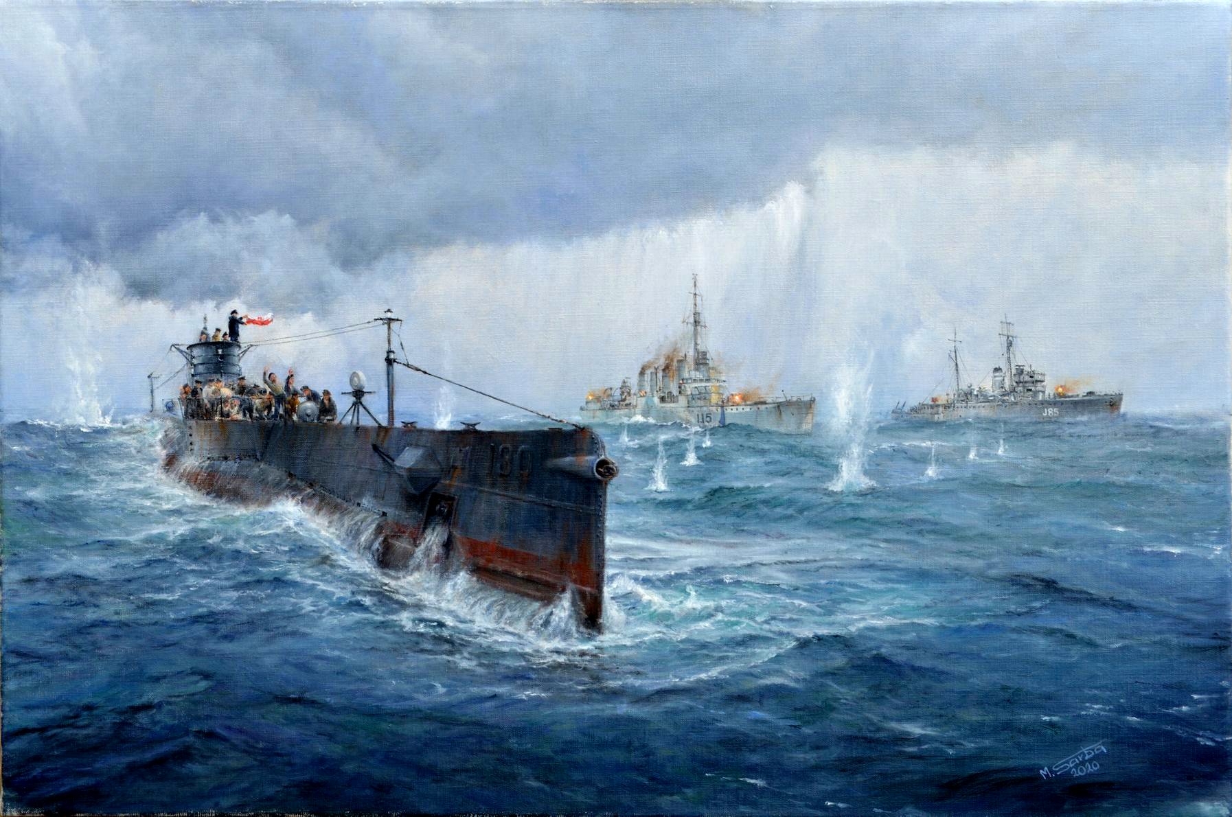 Przygotowujac sie do malowania obrazu przeczytalem wiele możliwych, a  dostepnych dla mnie publikacji. ORP “Jastrzab” zostal odtworzony na podstawie opisow oraz nielicznych zdjec oraz modeli biorac pod uwage ze okret zmienial czesciowo swoj wyglad z ubiegem czasu. Podobna sytuacja byla z okretami “St. Albans” oraz tralowcem HMS “Seagull”.