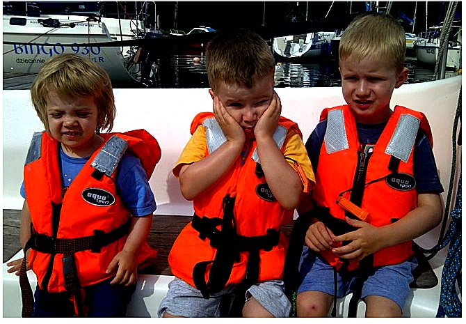 Jacht stojący na cumach, poruszany falą co chwilę uderzał o nabrzeże. Siedzący na materacu roczny brzdąc był co chwilę wytrącany z równowagi i denerwując się nieznanymi zjawiskami przewracał się na materac. Początkowo bardzo się buntował, ale po pół godzinie wpadł w rytm i opanował problemy z zachowaniem równowagi, przestał też zwracać uwagę na harce jachtu przy nabrzeżu. Po zaspokojeniu potrzeb Pawełka wypłynęliśmy na Zatokę Pucką.