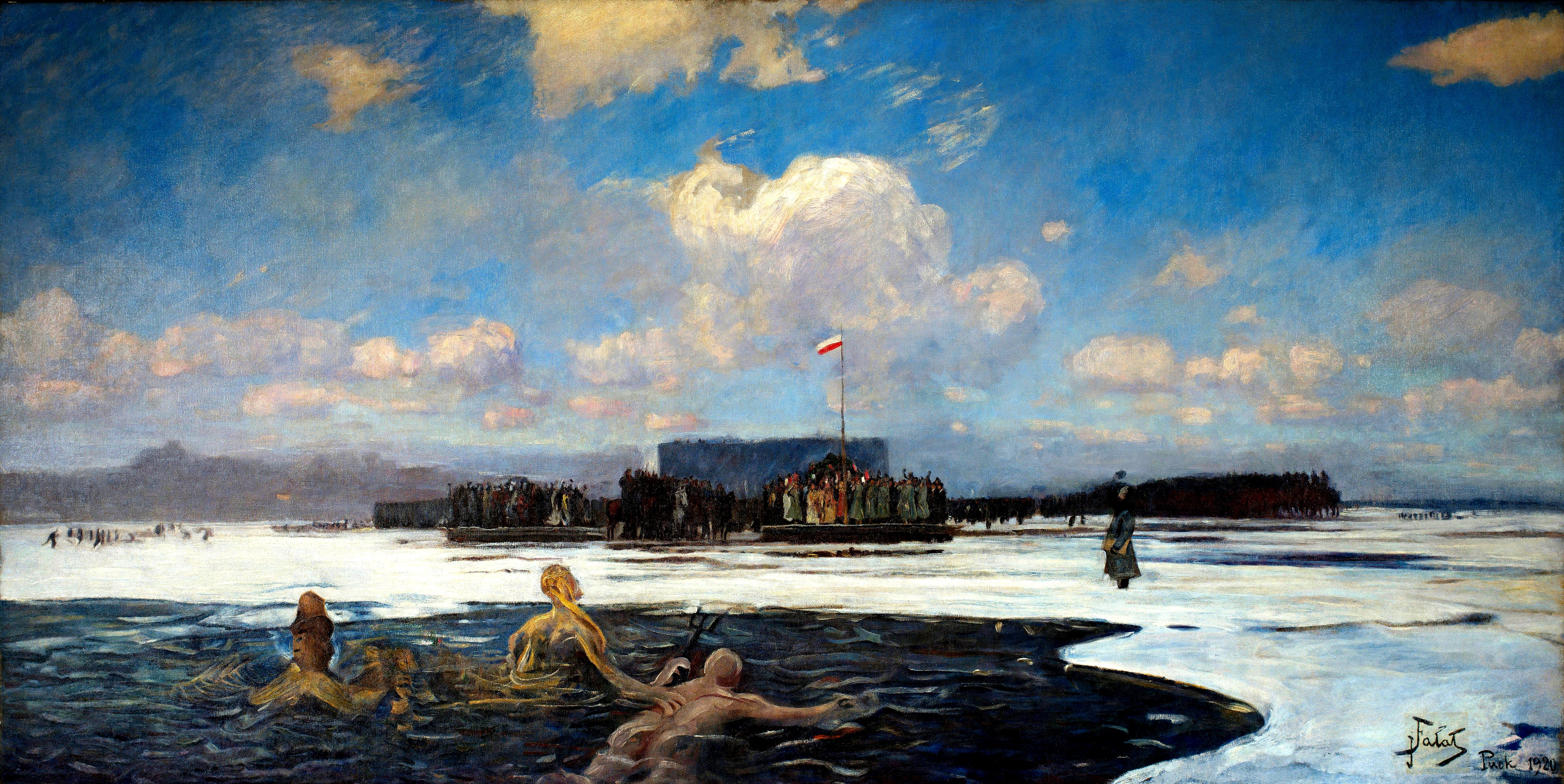 Oba przedstawione obrazy to alegorie, Fałata bardziej monumentalna i ewidentnie nawiązująca do Matejki i jego Chrztu Polski. Jeżeli ktoś przypuszcza, że jakieś nagusy taplały się w przeręblu w momencie gdy Generał Haller, który konno po slipie zmoczył końskie kopyta w morzu, wrzucał do Zatoki platynowy pierścień to najwyraźniej musi pracować w NMM w Gdańsku.