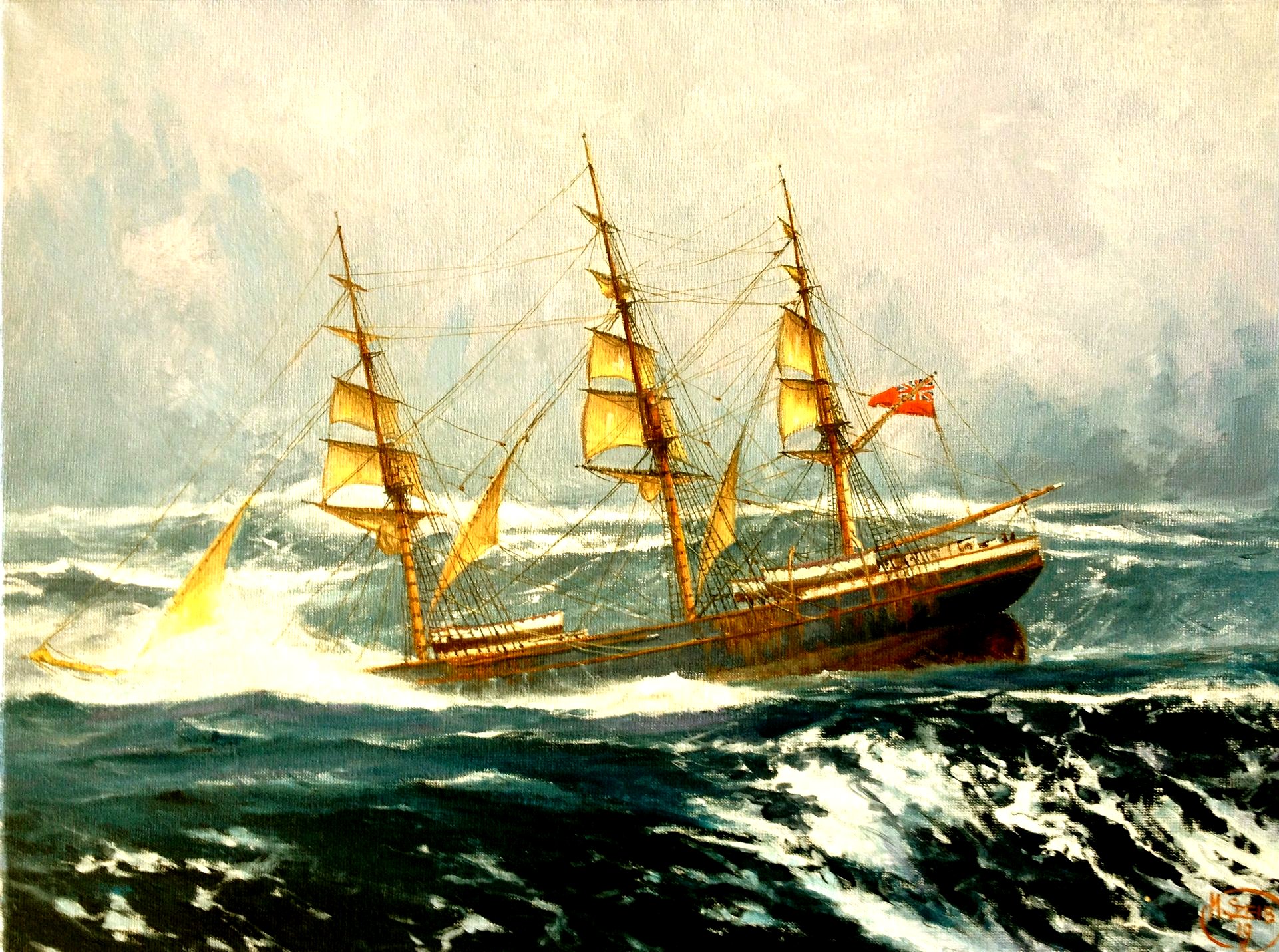 Ten obraz nie jest przesadną wizją i Mirosław Szeib dobrze oddal atmosferę sztormu. Morze jest skotłowane i odległości między grzbietami fal skróciły się zapewne w skutek interferencji, gdy przesuwający się niż wzniecił falę z kolejnego kierunku. Potwierdza to zresztą układ statku, który płynie baksztagiem lewego halsu, a więc wiatr ma prawie z tyłu (tak ustawione żagle i tak z wiatrem układa się bandera), a tymczasem fala przychodzi w pół burty i grozi wywróceniem żaglowca na bok. Co zadecyduje kapitan?