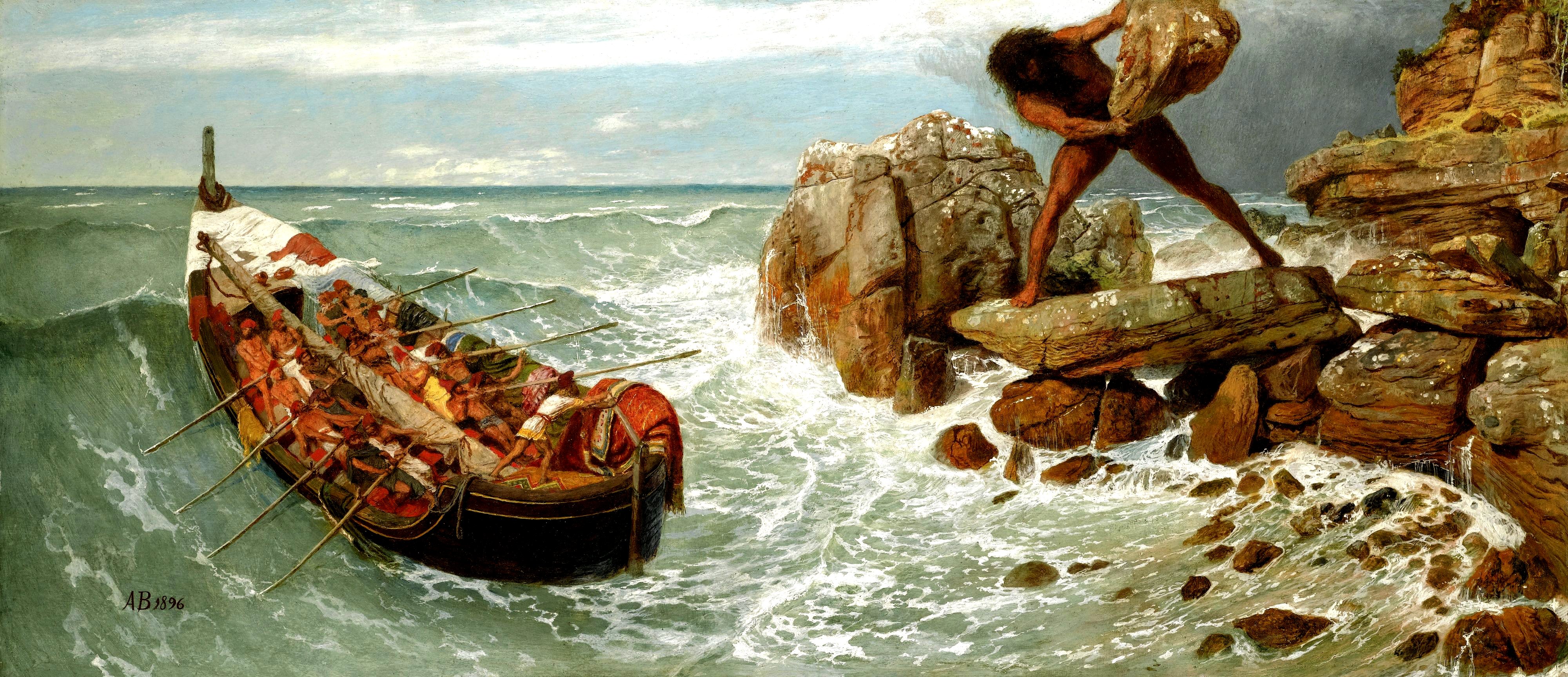 Tu na obrazie Arnolda Böcklina widzimy epizod z jednookim Cyklopem, który choć oślepiony ciska za Odyseuszem głazy… Maszt ze zwiniętym żaglem leży wzdłuż łodzi, a żeglarze napierają na wiosła, by przebić się przez strefę przyboju. Dalej będzie można postawić maszt w opętniku i rozwinąć żagiel. Nie znamy nazwy tego stateczku, za to inny heros mitów greckich, Jazon, płynie na jednostce wiosłowo-żaglowej Argo z ekipą, którą od nazwy okrętu nazwano Argonautami.