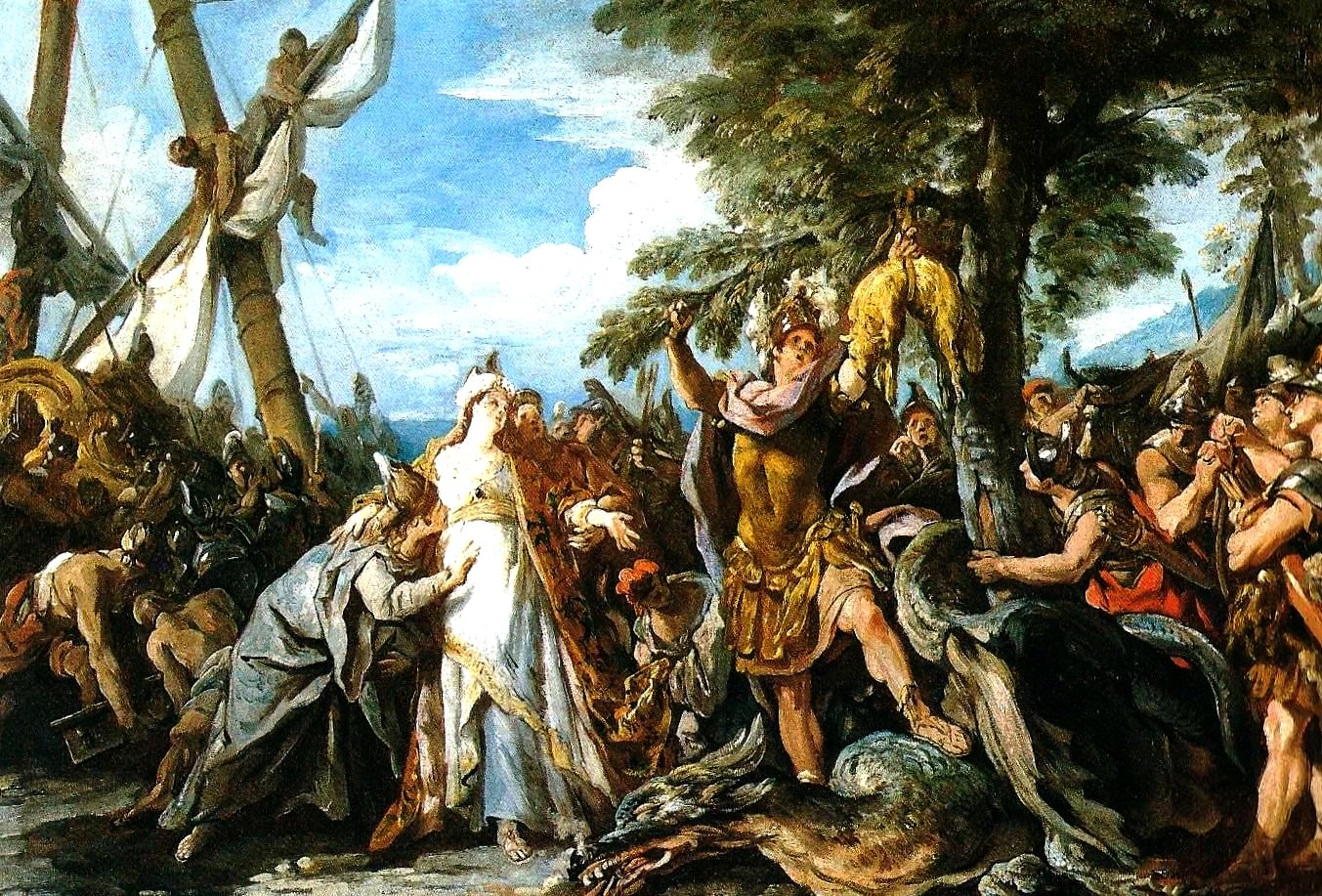 Na obrazie Jean-Franҫois Detroya widzimy w drugim planie zwijanie żagla rejowego Argo bez użycia perty, na której można by oprzeć nogi. Misja zdobycia Złotego Runa w Kolchidzie nad Morzem Czarnym powiodła się dzięki Medei, której Jazon obiecał wierność aż po grób. Przysięgi jednak nie dotrzymał, podobnie jak inny mityczny bohater, Tezeusz.