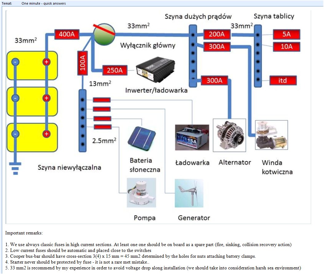 how we would estimate optimal intersection of quite new wiring of revitalized 50 ft cruiser? Dimension of copper bus bar connecting hotel batteries mentioned in the TL post? Fuses? One general or in each section separate one? Recommended current? Automatic or classic fuse?