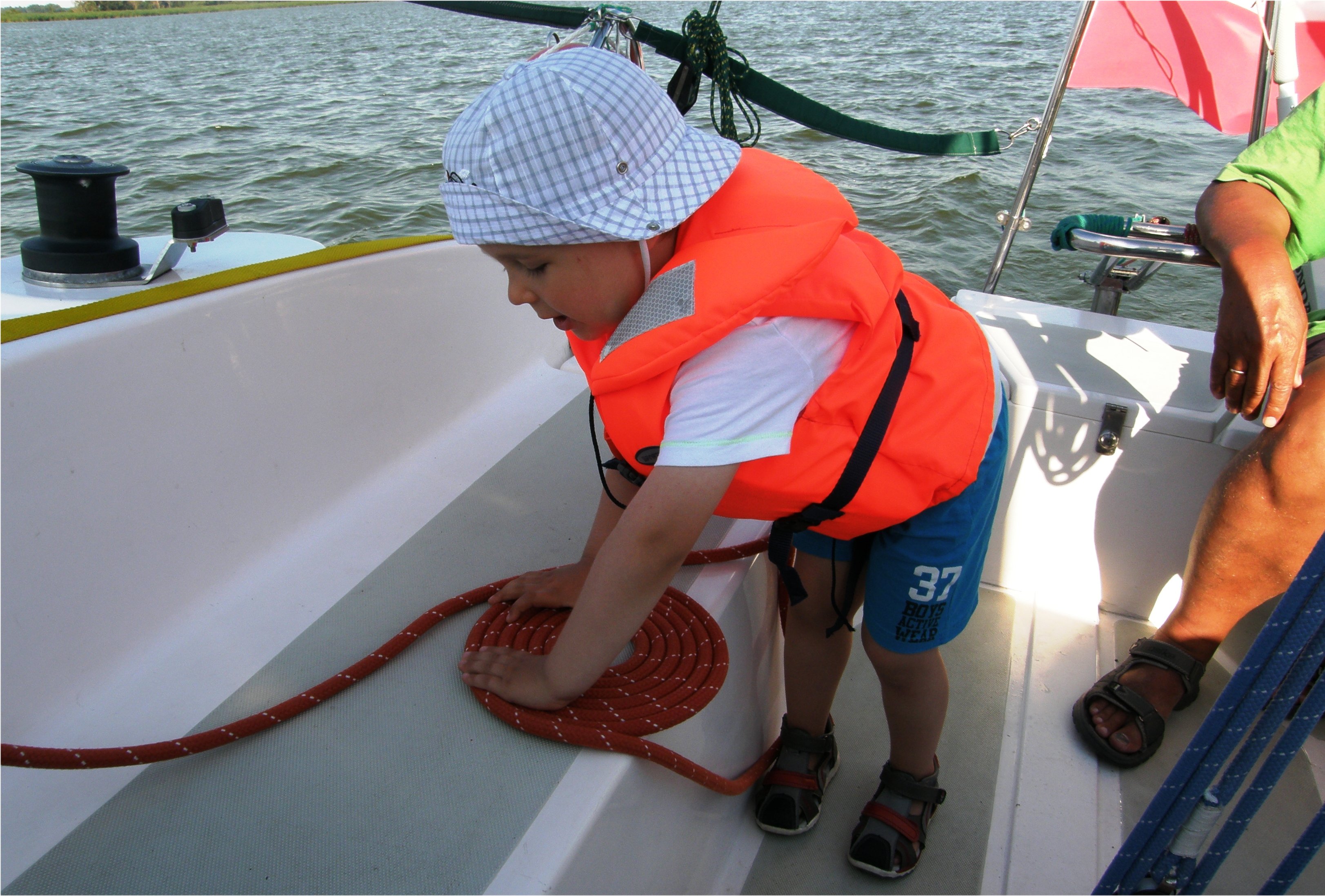 Paweł jest już na tyle świadomy, że mogliśmy go w tym rejsie zapoznawać z podstawowymi umiejętnościami żeglarskimi, jego udział w sterowaniu oraz nieskomplikowanych manewrach sprawiał, że czuł się bardzo potrzebny, a jednocześnie opiekunowie mieli zagospodarowany czas młodego żeglarza. Ważne były również prace związane z klarem na pokładzie, w które bardzo chętnie się angażował.