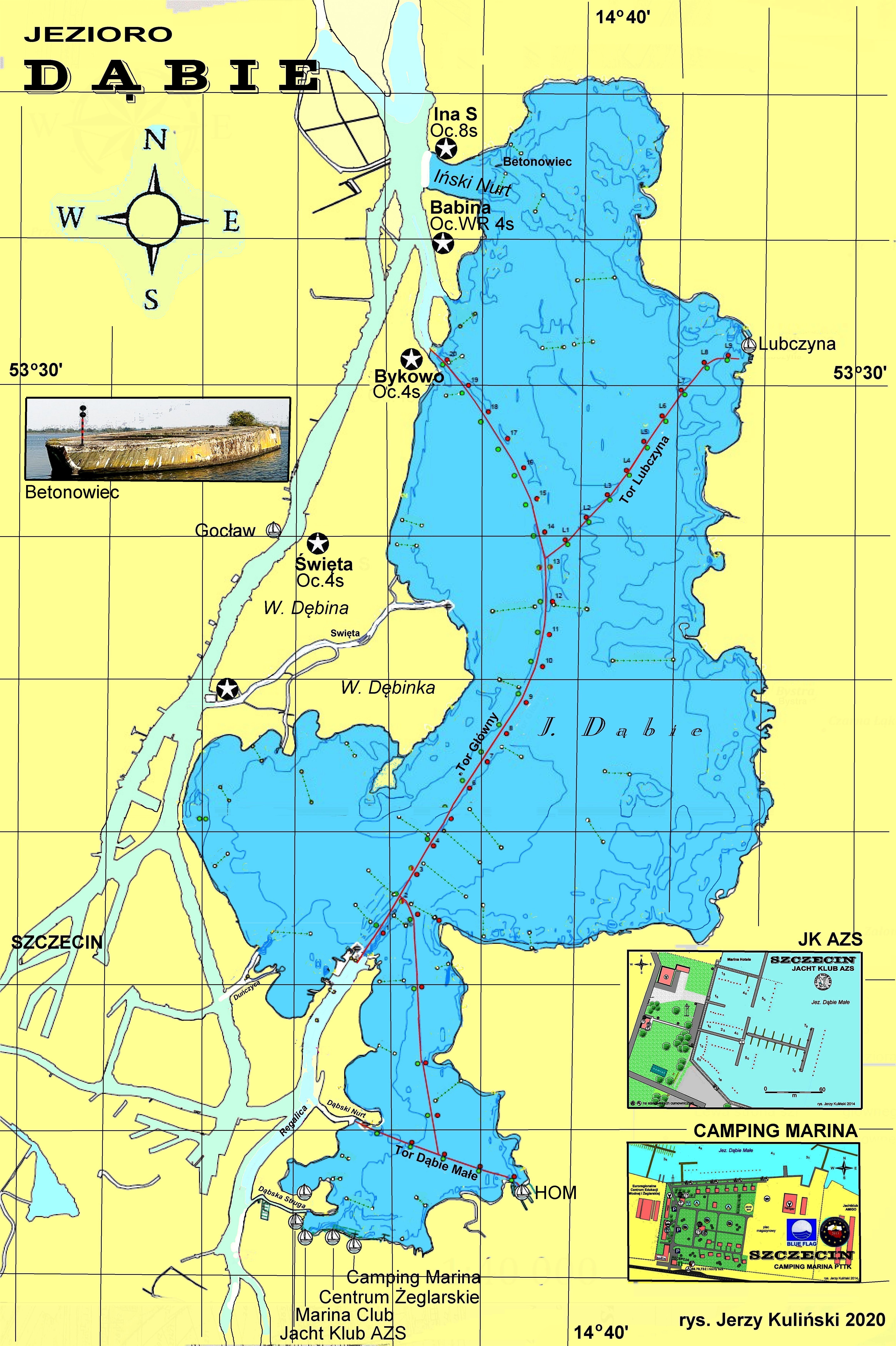 Przez jezioro prowadzą tory oznaczone bojami. Główny od ujścia Regalicy do Ziemi Umbriagi (oficjalna nazwa Czapina). Tor poprzeczny z Dąbskiego Nurtu (Kanał Jacka) do przystani HOM (Harcerski Ośrodek Morski) i nowopowstałej Mariny Dąbie. Trzeci tor prowadzi od toru głównego do południowej części jeziora, czyli Małego Jeziora Dąbie. Jest jeszcze jeden tor: od głównego do Lubczyny.