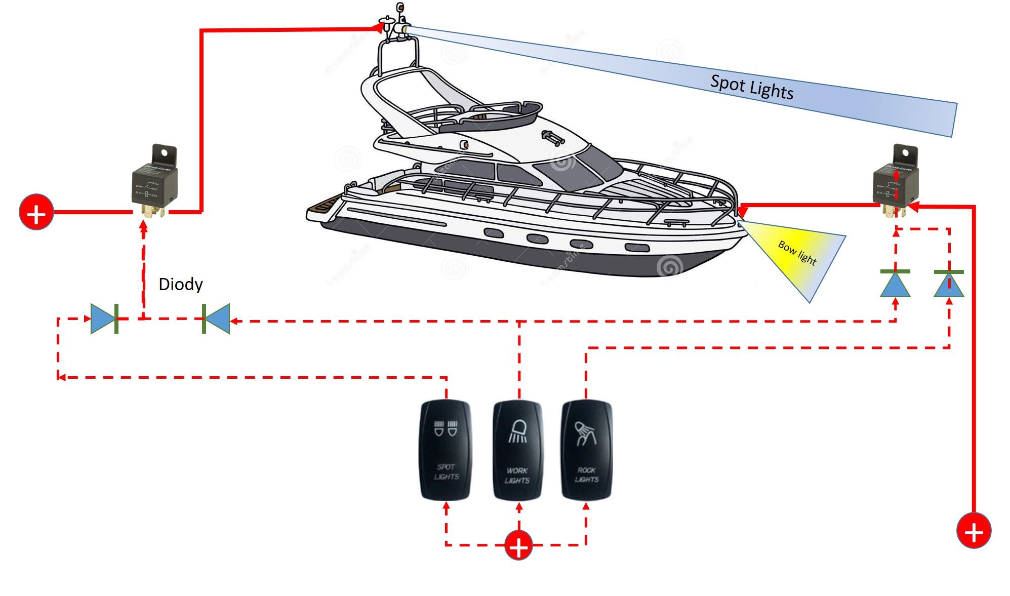 jestem pełen podziwu dla sprytności tego rozwiązania, ale ono nie spełnia warunku: to avoid heavy rewiring. W tym rozwiązaniu do obu lamp trzeba ciągnąć przez całą barkę nowe druty (do obu latarń), jak to widać na rysunku. Czy też się mylę?