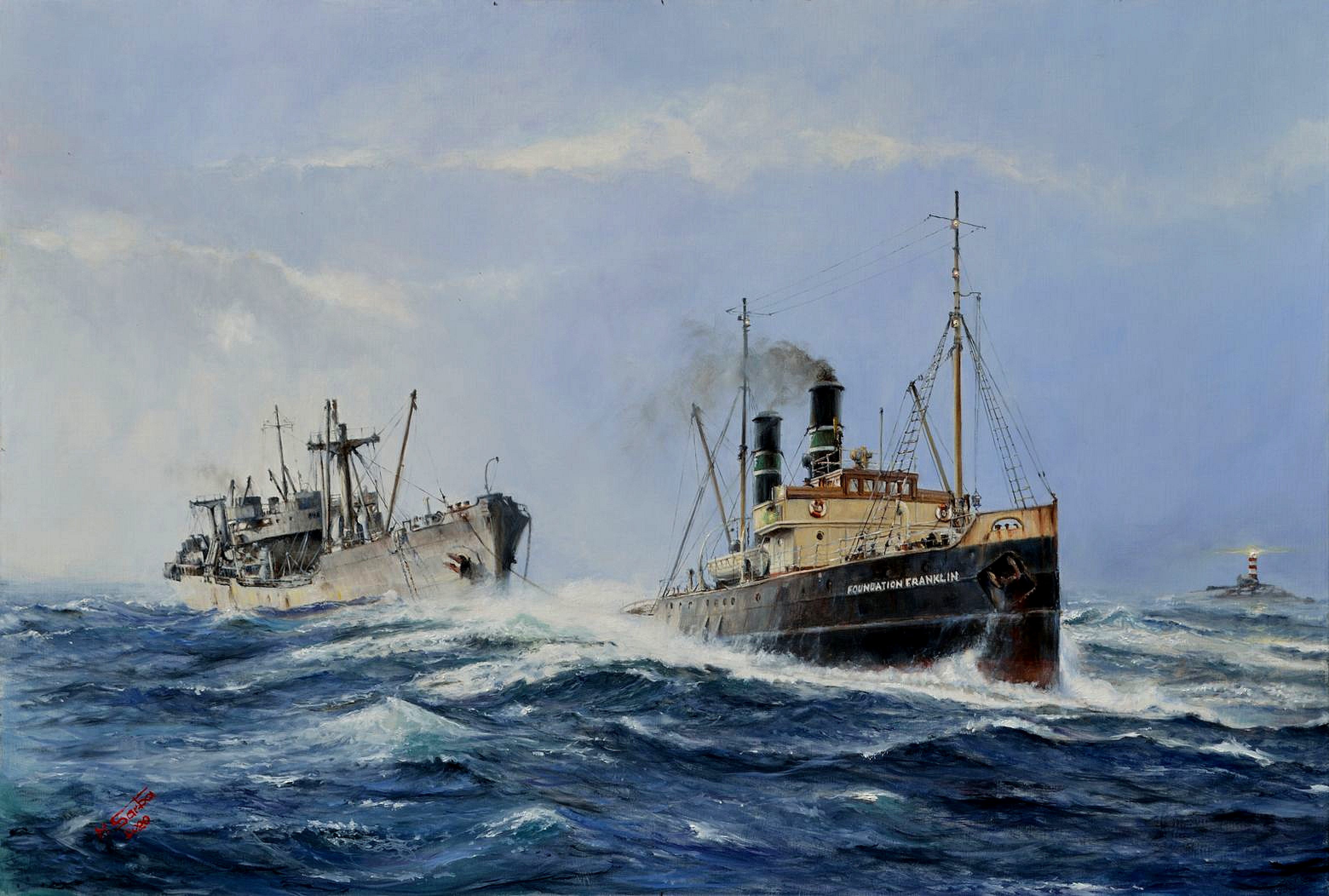obraz przedstawiający holowanie cudem ocalonego amerykańskiego frachtowca storpedowanego