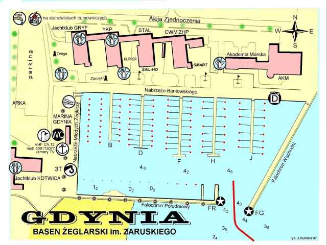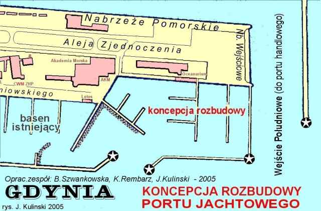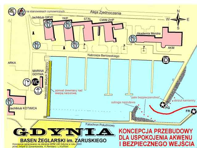 Odwiedziłem biuro MARINY GDYNIA. Dowiedziałem się, że niebawem ruszy przebudowa wejścia. Obiecano mi przysłanie rysunku, który zostanie wykorzystany w II wydaniu locyjki ZATOKA GDAŃSKA. Jestem niezmiernie ciekaw, na ile (i czy) wykorzystano w nowym projekcie sugestie zawarte w koncepcji opracowanej w 2005 roku na zlecenie Biura Rozwoju Miasta przez zespół 2 archtektek oraz moim. Już widać, że nie uwzgledniono naszego postulatu, aby nabrzeze M.Ż. (zachodnie) wykonać jako skarpę narzutową (kamiennaą z nadwieszonym pomostem. Taka konstrukcja nabrzeza (powszechnie stosowana w zagranicznych portach Bałtyku) bardzo skutecznie gasi falowanie w basenie. Poprzedni projekt (wstępny) był zupełnie (nautycznie) do niczego - zakładał przedłuzenie Falochrony Wschodniego o około 40 metrów. Przede wszystkim - jeszcze bardziej ryzykowne wejscie (i wyjscie) przy wschodnim wietrze, oraz zignorowanie stałego przyblizania się izobaty 2 metrów do głowicy Falochronu Południowego ("inwazja plaży"). Podrzucam Wam takze rysuneczek koncepcji II etapu rozbudowy (obszar vis a vis oceanarium) - z wspomnianego opracowania sprzed 2 lat. Zobaczymy co mądre głowy postanowią.