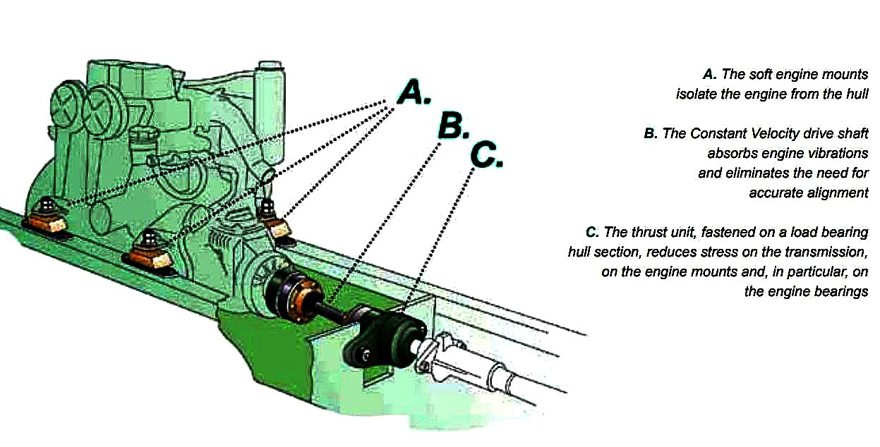 Ja co prawda nie mam Aquadrive'ra tylko wał napędowy połączony z silnikiem ( MD1) za pośrednictwem wału kardana. Koniec wału przechodzi przez łożysko ( nie oporowe) i jest ono na sztywno zamocowane. Czyli sam wał mam mocowany w dwóch punktach - łożysko wodne oraz drugie łożysko "toczne" zamocowane na sztywno w grodzi. Wibracje silnika przenoszą się na kadłub mimo dodatkowego sprzęgła elastycznego pomiędzy wałem kardana a silnikiem ( rewersem ). Oczywiście silnik na poduszkach.