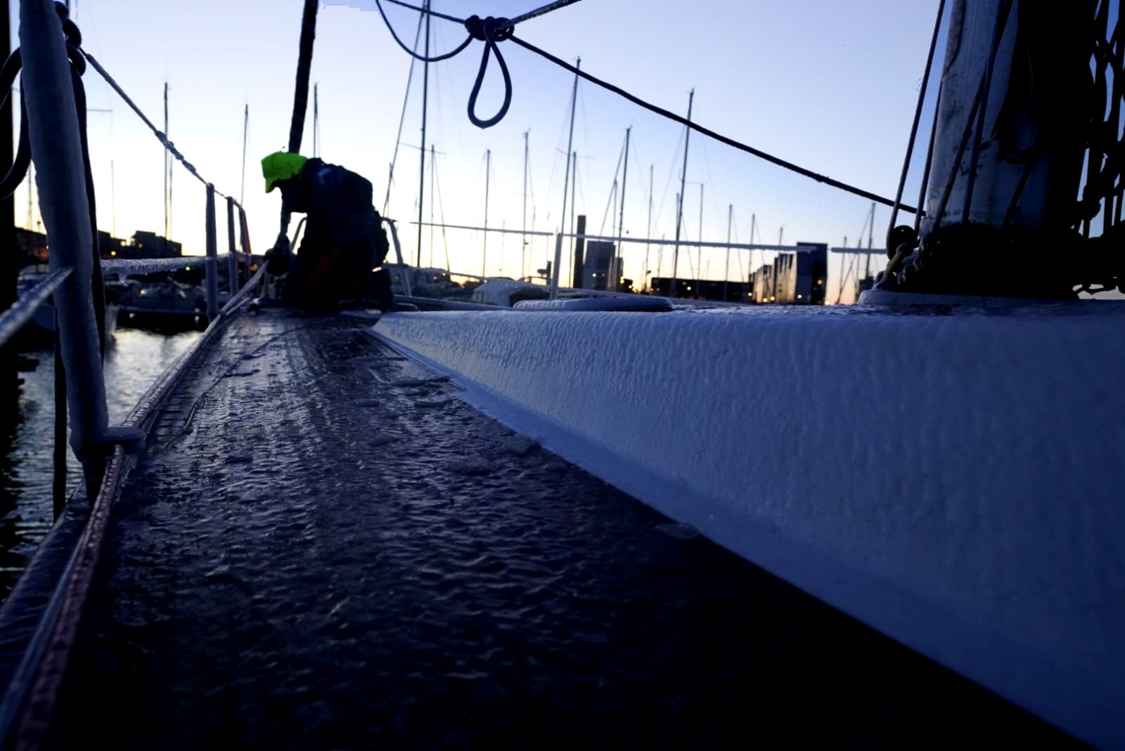 Manewry portowe bardzo wolne, ostrożne. Ruch na pokładzie na czworaka. Momentami trochę śmiesznie, ale właściwie to żartów nie ma. Obuwie żeglarskie nie jest projektowane do poruszania się po lodzie. Całe szczęście poziom sprawności załogi był wysoki i do ostatniej kei w tym rejsie dobiliśmy bezpiecznie.