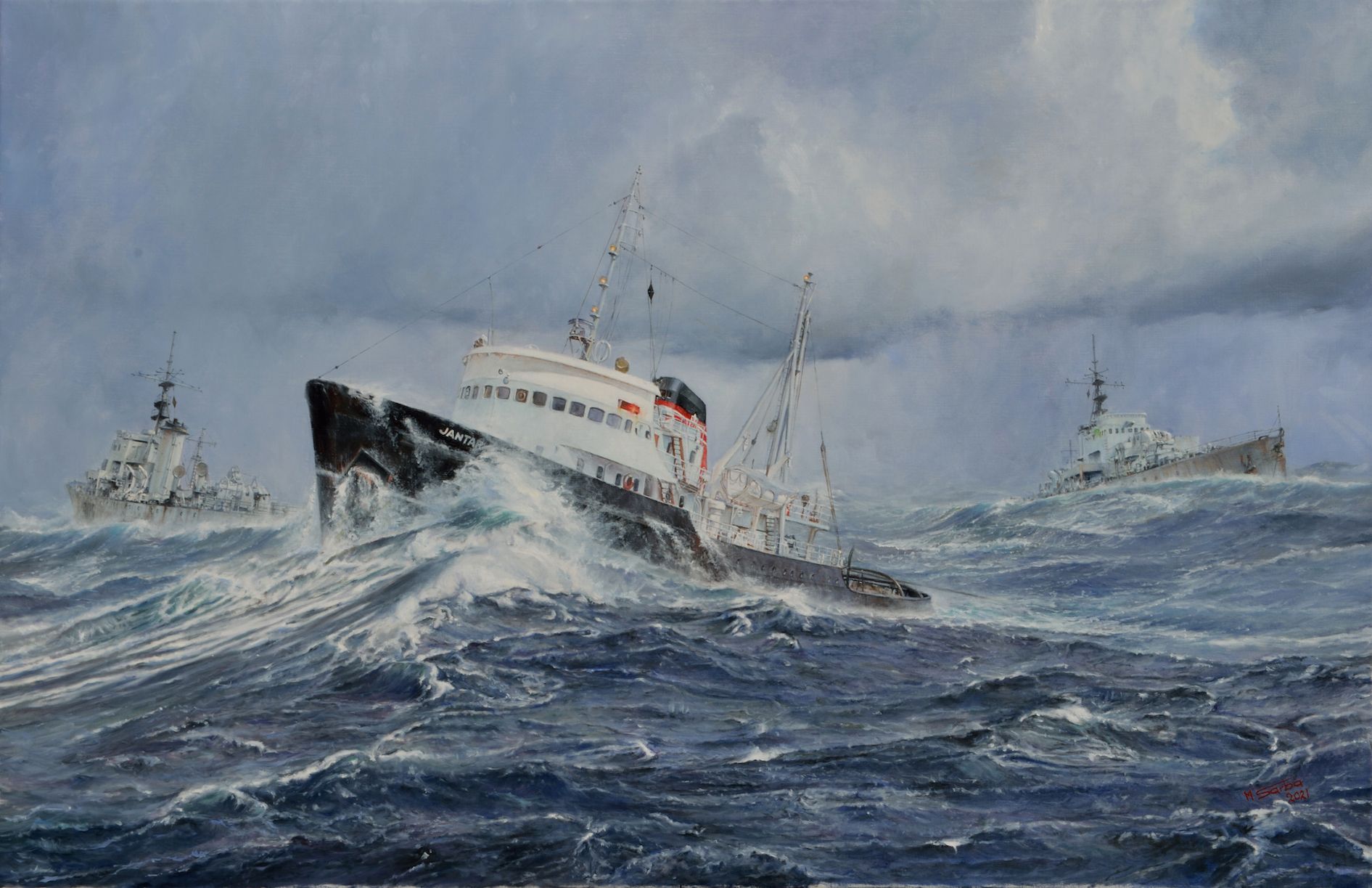 Na obrazie jest przedstawiony właśnie ten “Piaty Dzien” . „Jantar”podchodzi wyceniając sytuacje po to zeby zrobic jedna cyrkulacje dodatkowo i podejść od strony rufy do urwanej i przechylonej “305” w celu przekazania następnego prowizorycznego holu. Z prawej strony obrazu widać ciągnięta “317” z rozbitym dziobem. Ta podróż holownicza trwała 35 dni kończąc się 4 Marca 1966 w La Spezia. Następne dwa holowania identycznych jednostek już trwały tylko 14 dni każda.