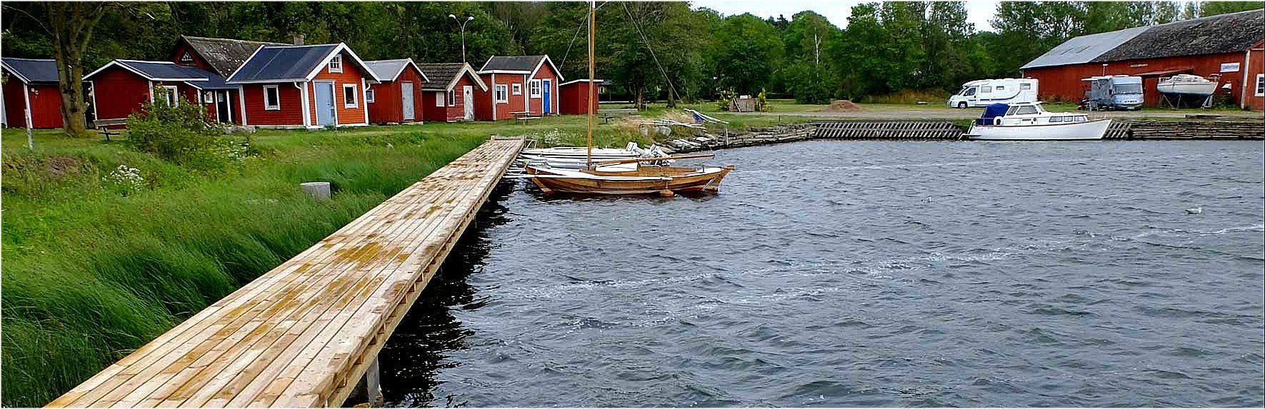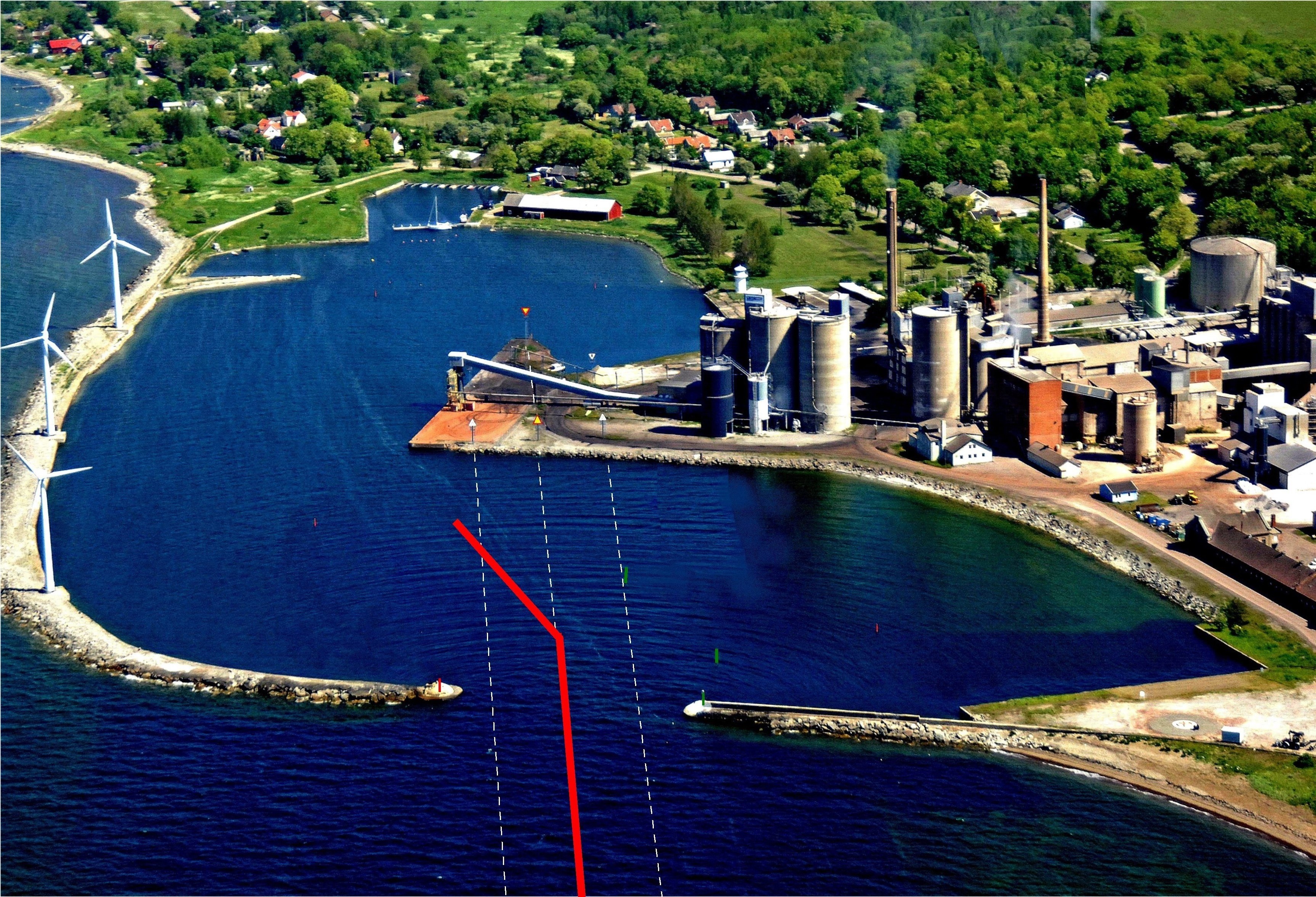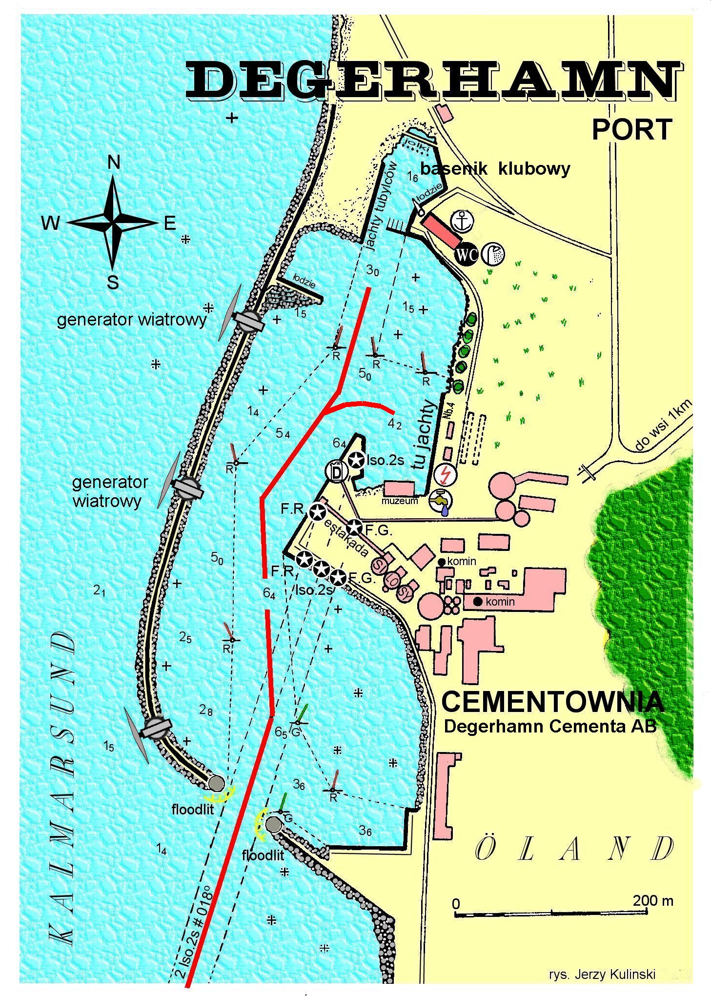 PORT. Cichutki, zadbany port to rozległe akwatorium o owalnym kształcie (639 x 250 m)- usytuowane prawie równolegle do naturalnej linii zachodniego wybrzeża wyspy Oland. Tylko w północnym krańcu widać niewielki (100 x 60 m) basenik przyfabrycznego jachtklubu. Portu bronią falochrony narzutowe zbudowane w tym samym czasie co naszego Władysławowa. Na falochronie 3 wysokie generatory wiatrowe. Głębokości w porcie zadawalające, bo „statkowe”, ale tylko na obszarach obstawionych