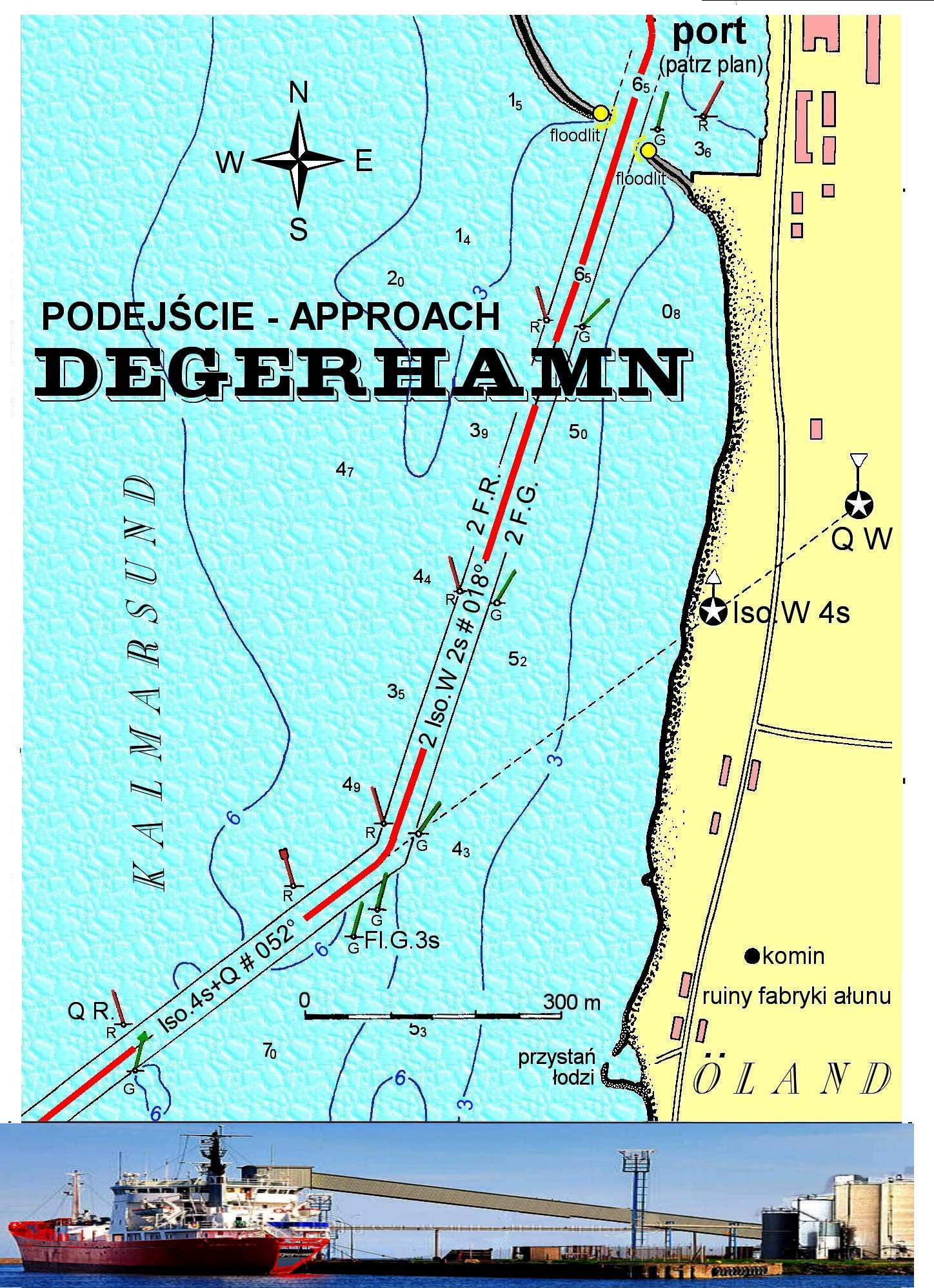 Koicydencja obu kominów wyznacza linię pozycyjną krk. 136o. Do portu podchodzić będziecie jednak tylko torem wyznaczonym najpierw przez pierwszy nabieżnik Degerhamn S – krk. 052o. Nabieżnik dzienny wyznacza para pomarańczowych trójkątnych tarcz – stojących na brzegu w odległości około 3 kabli na S od południowego skraju portu. W nocy jest to para białych świateł izofazowych o okresie 2 sekund.