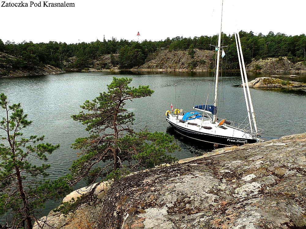 W kierunku Vastervik wyruszyliśmy w niedzielę o 1400. Nadal wiało żwawo z północy. Nad lądem gromadziły się deszczowe i burzowe chmury... ale szczęśliwie przeszły nam przed dziobem. Do zatoczki Pod Krasnalem (zatokę tę nazwali tak Teresa i Franek Zatorscy, gdy polecali nam ją w 2006 roku) wpływamy około 1900. Jest tu pięknie i cicho. Cumujemy tak jak to w szkierach. Kotwica z rufy, dziób do grubych drzew, dużych kamieni. Czasami można spotkać haki wbite w szczeliny skalne.