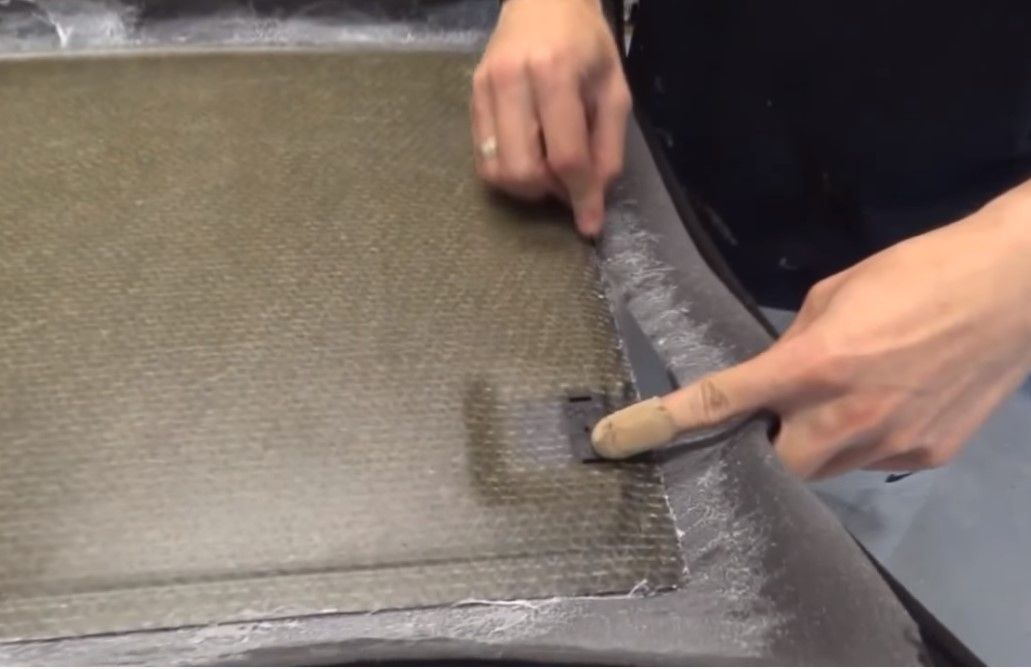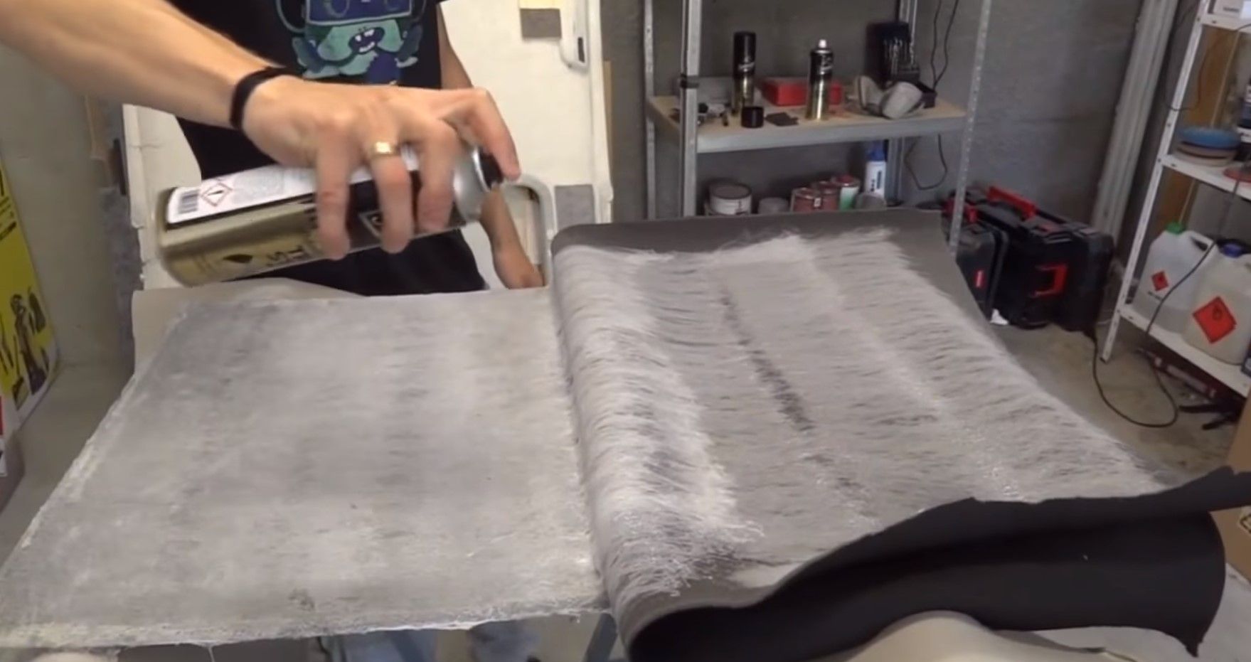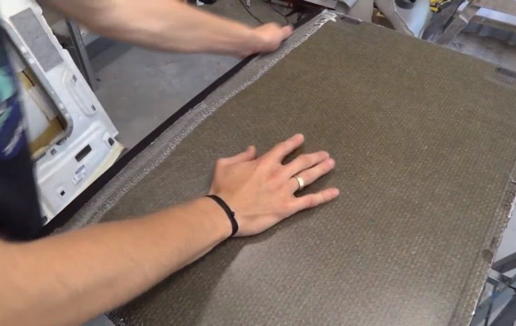 Czekamy kilkanaście minut po czym smarujemy klejem 2,5 milimetrowe krawędzie sklejki. Podwijamy brzegi. W przeciwieństwie do podsufitek samochodowych NIE WOLNO WYWIJAĆ JEST MATERIAŁU NA WEWNĘTRZNĄ STRONĘ.