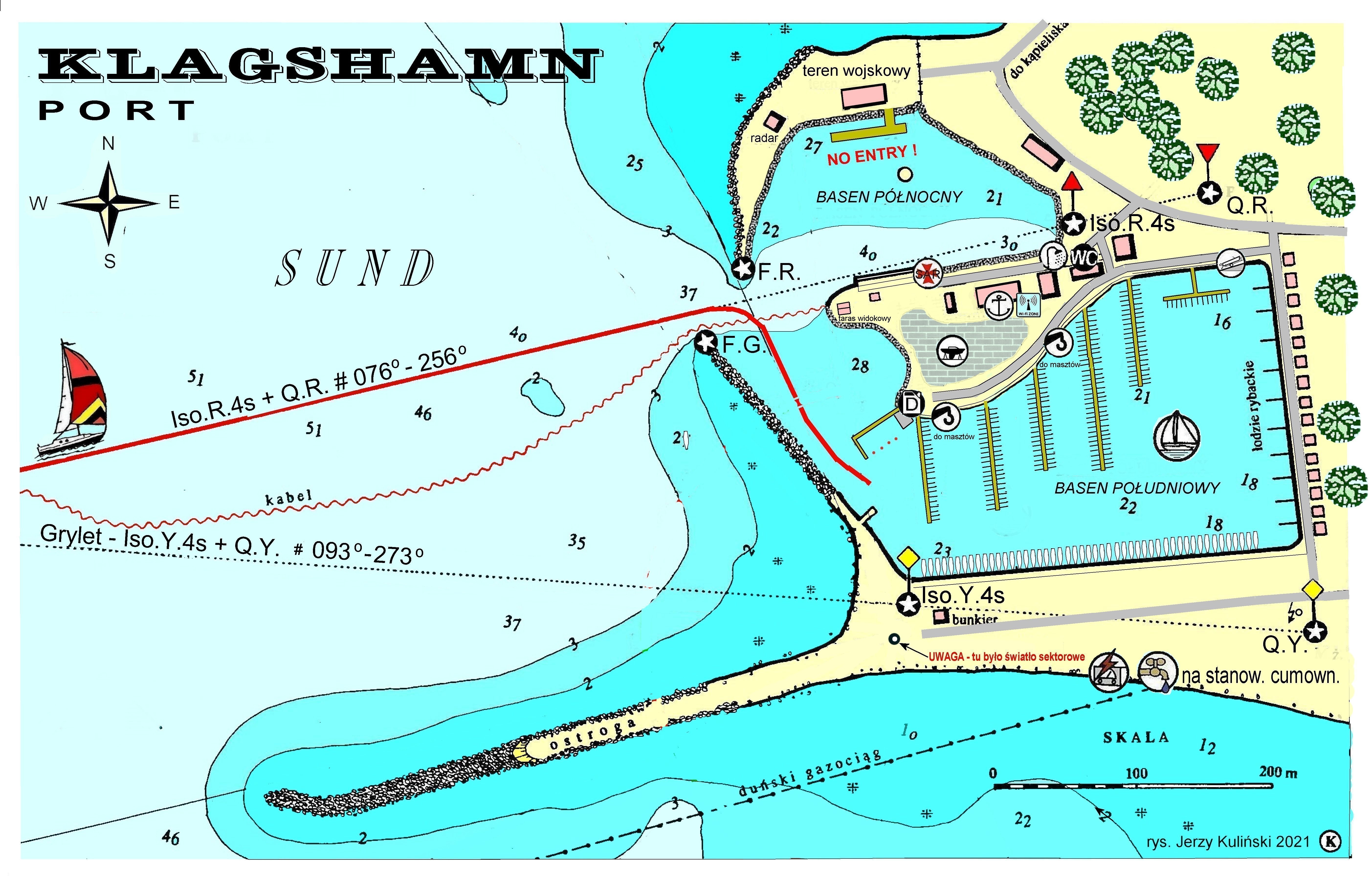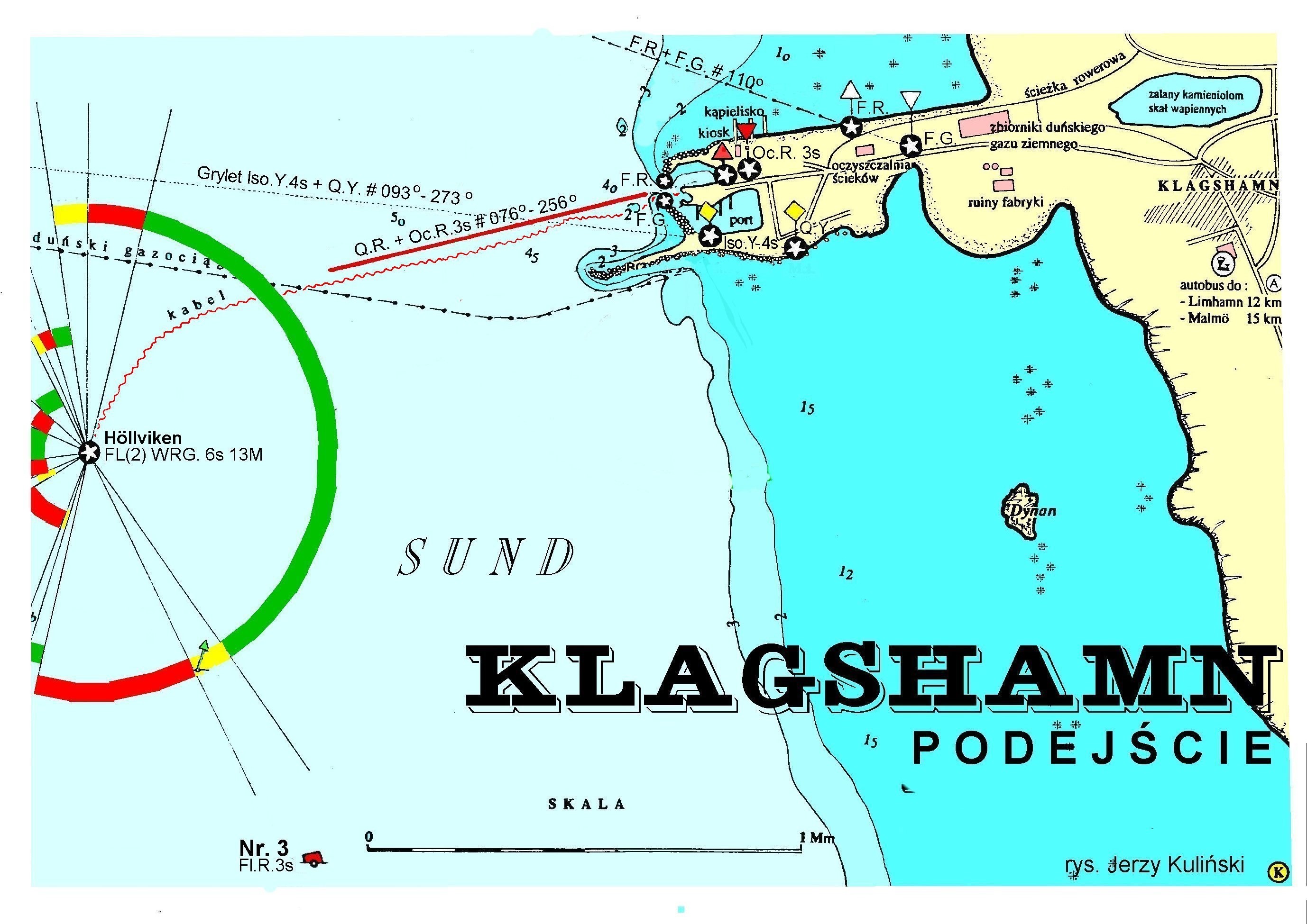 Od światła Hollviken powinniście sterować na NE, pokonując dystans około 8 kabli – tak aby zobaczyć nabieżnik portu w namiarze 076o. Nabieżnik dzienny to dwie pomarańczowe tarcze trójkątne zamocowane na kratowych wieżach stojących na zapleczu Basenu Północnego portu Klagsahamn. Nabieżnik nocny to światło migowe żółte (Q.Y) (sygnał przedni czyli dolny) oraz przerywane czerwone o okresie 3-sekundowym (Oc.R.3s). Linii tego nabieżnika się trzymajcie dokładnie ponieważ w sąsiedztwie wyczerpanej rynny toru podejściowego znajdują się dwa podwodne wzniesienia odległe od lustra wody tylko o 2 metry lub nieco mniej. Tu istotna uwaga aktualizacyjna: nie szukajcie światła sektorowego, które przez laty było usytuowane u nasady przyportowej ostrogi kamiennej. Tego światła już nie ma. To dobra zmiana; oceniam ją jako uporządkowanie informacyjne akwenu przed portem.