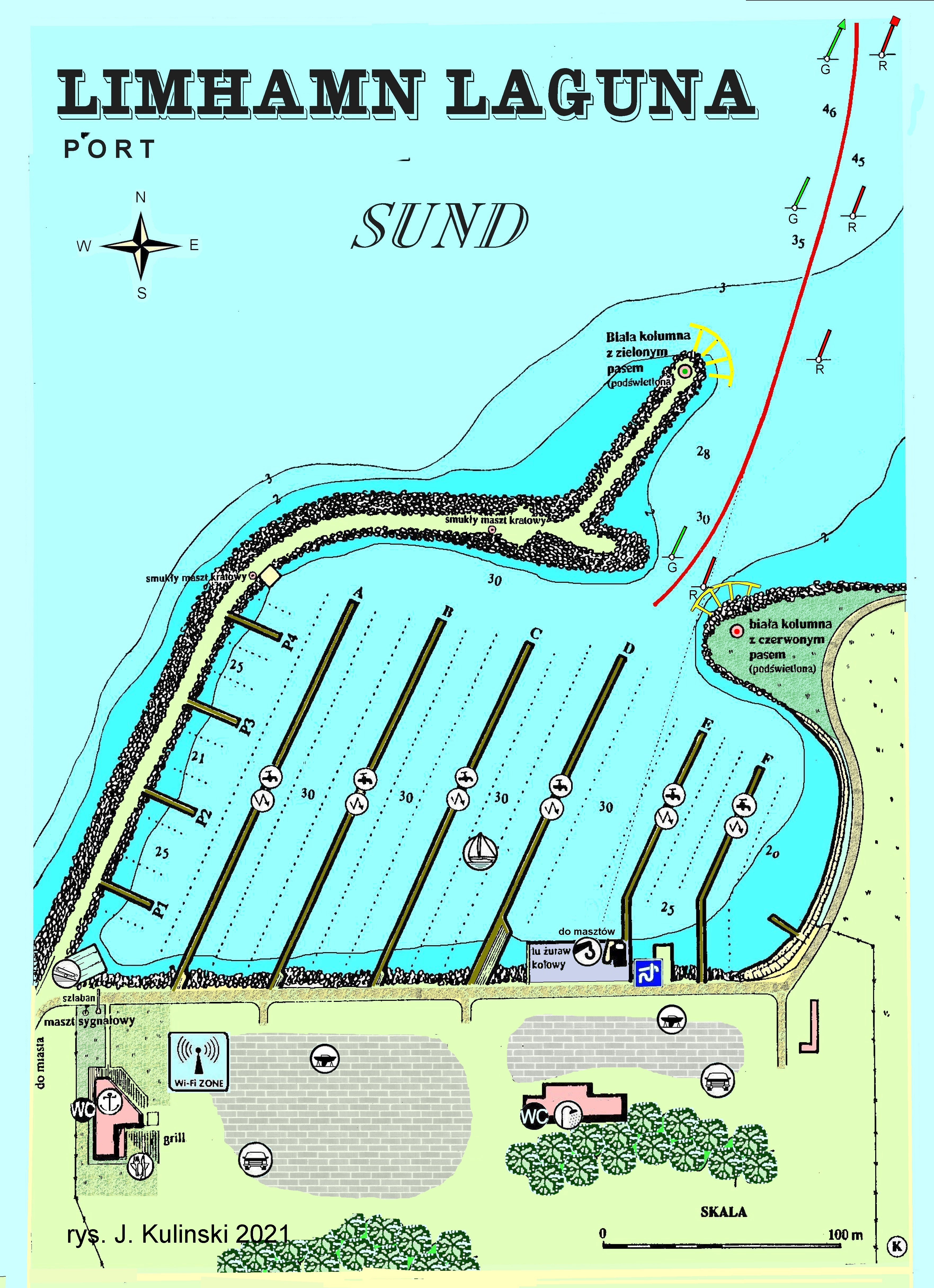PODEJŚCIE. Malmo - Limhamn położone jest na południowym skraju zatoki Lomma Bukten, w przewężeniu Sundu powodowanym przez duńską wyspę Saltholm oraz otaczające ją płycizny. Port jachtowy Laguna przylega do portu handlowego Centralhamnen Limhamn, do którego wejście jest bogato oznakowane. Na NW, w odległości 1,8 M od Laguny stoi 10-metrowej wysokości stawa świetlna Kalkgrundet, której sylwetkę i lokalizację zobaczycie na mapce Limhamn Laguna – Limhamn Matina – podejście (poprzedni rozdział). Jest to cylindryczna biała wieża z czerwonym pasem. Świeci światłem przerywanym (przerwa 1,5 sekundy) o okresie 9 sekund w sektorach zielonych i czerwonych. Będzie dla was bardzo dobrym punktem orientacyjnym na wodzie. Pomiędzy nią i lądem przebiega równolegle do linii brzegowej tor wodny Trindelrannan, którym podążają statki do i z portu handlowego Malmo. Zatem pilnujcie się. Uważać też powinniście na szybkie promy kursujące między Sodrahamnen Limhamn a duńskim portem Dragor na wyspie Amager.