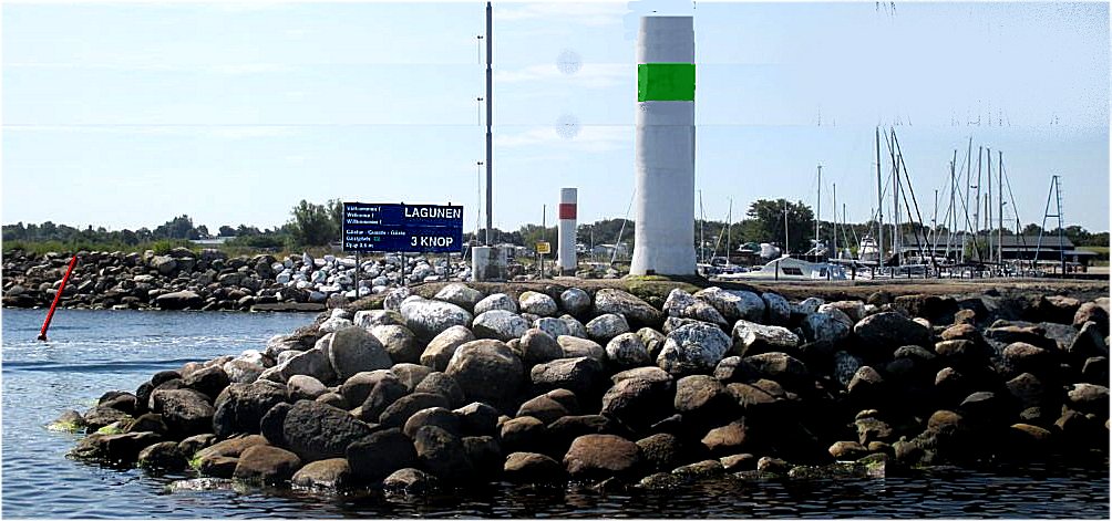 No dobrze, ale gdzie jest wejście do Limhamn Laguny? Las masztów jachtowych jest już doskonale widoczny, ale gdzie jest wejście wśród narzutowych narzutowych falochronów? Wypatrujcie 2 białych kolumn. Jednej z czerwonym, drugiej z zielonym pasem. Jeśli dobrze je widzicie, to znaczy że wiecie gdzie jest to wejście.