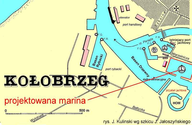 Jak wspomniałem w naszej telefonicznej rozmowie - przesyłam na fragmencie planu z Twojej ksiązki "Polskie porty otwartego morza" zaznaczone miejsce przyszłej mariny w Kołobrzegu. Będzie sie ona mieściła na terenie obecnej bazy "Hydrobudowy", od kanału do ul. Warzelnianej oraz na terenie ośrodka żeglarskiego HOM