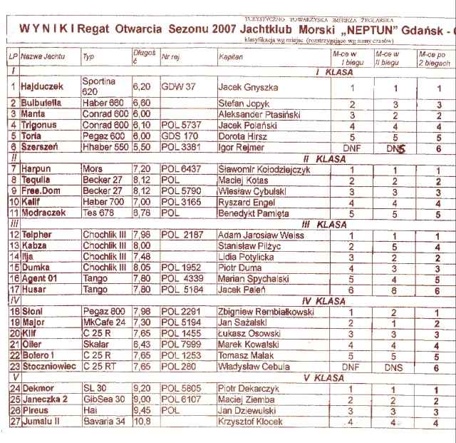 Przepraszam za opóźnienie. Jak wiecie z poprzedniego newsa - czekałem na Komisję Regatową i się... nie doczekałem. Heniek Brylski zdjął wyniki z tablicy ogłoszeń i przysłał mi je faxem. Dziękuję.