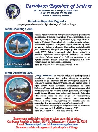 Kapitan Andrzej Piotrowski, lider Karaibskiej Republiki Żeglarskiej opracował dwie locyjki obejmujące archipelagi wysp Polinezji Francuskiej oraz Królestwa Tonga. Są po polsku !  Książek nie widziałem, jak wpadną mi w ręcę, to się nad nimi poznęcam (recenzje). Teraz to tylko przynęta dla wybierajacych się na oceany.