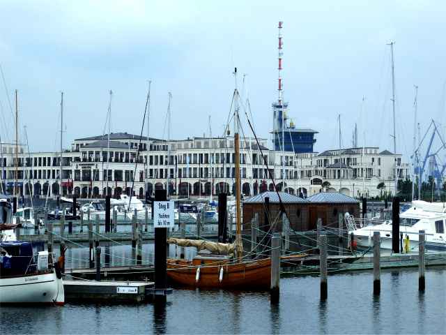 Marina, mariną, a najważniejszą jest cześć kongresowa, sympozjalna, balangowa, hotelowa, restauracyjna - po prostu recepcyjna. Jak Niemcy dostaną kiedyś znowu Olimpiadę, to obiekt jak znalazł. Marina ma 750 stanowisk cumowniczych oraz moze przyjąć kilka megajachtów o długości do 60 m. Oczywiście jest tu wszystko, oprócz ... jachtów. Marinę zastałem wypełnioną w kilkunastu procentach. I wcale nie jest to skutek wysokich cen - postój jachtu LOA 9,0 m kosztuje 15 euro/dobę, a 12-metrowca - 20 euro. Do Warnemunde chodzi prom,a żeglarze jednak wolą postój w przystaniach lewego brzegu rzeki.