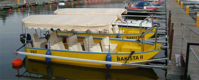 Więcej jachtów w marinie, głębiej na wejściu do basenu (2,5m), bo wypatrzyłem w porcie zgrabną, mała pogłebiarkę ssącą - pracującą na szczudłach. W basenie dwie ładne żółte łodzie motorowe z baldachimami ("Bakista I" i "Bakista II") - przygotowane do usługi "zeglugi poprzecznej". Niestety - administracja morska wymaga, aby prowadzili je ludzie z morskimi papierami zawodowymi i do tego byli ratownikami. Czyli nawet emerytowany kapitan zeglugi wielkiej sie nie nada, bo od ratowników wymaga się też wysokiej sprawnosci fizycznej. Pat.