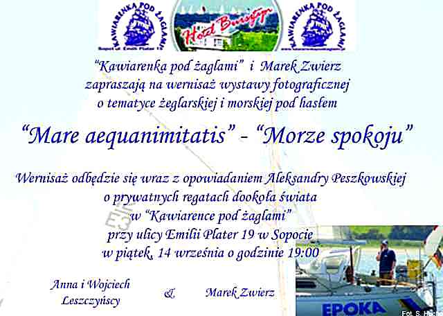 Otóż Marek zaprasza nas na druga już w tym roku wystawę swoich fotogramów. Podczas spotkania - gawęda Aleksandry Peszkowskiej o prywatnych regatach dookoła swiata.  Przymiotnik "prywatny" to silny magnes. A więc -  specjalna okazja dla mieszkańców 3-miasta, aby zrobić przyjemnośc Waszym oczom, uszom i ... podniebieniu. Jesteście tego warci!   :-)