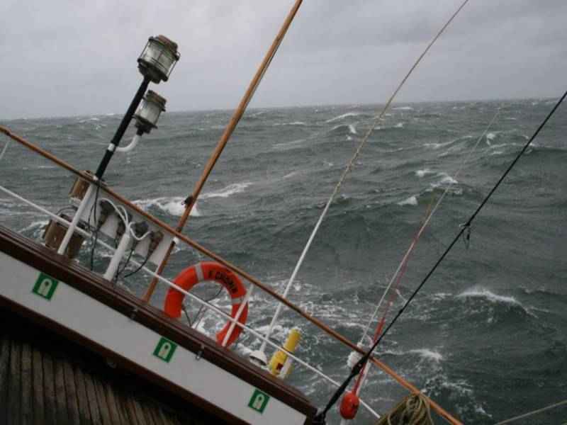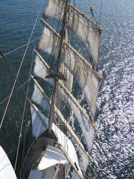 25. czerwca o 1500 odeszliśmy od kei i wtedy zaczęła się prawdziwa przygoda. „All hands on deck! Cumy rzuć, żagle staw! Na słone bryzgi wystaw twarz...” Przy zmiennych wiatrach i nieustającym trzasku aparatów fotograficznych cieszyliśmy się kolejnymi alarmami do żagli, które na początku spotykały się z wielkim entuzjazmem wśród załogi i obraliśmy kurs na Hel. Następnego dnia wiatr się wreszcie zdecydował skąd chce wiać i przeszedł do ofensywy. Po południu wiało 1B, wieczorem 3B, w nocy 5B, przy śniadaniu 7B a po śniadaniu 9B... Wzniosłe okrzyki „och” i „ach” zmieniły się w niewyraźne „uhh” i „bleh” a kuk na obiad dał schabowe kotlety. Nie pierwszy raz byłem na morzu, ale dziewiątkę i 4m fale widziałem pierwszy raz... Kto nie przeżył, nie uwierzy jak piękny to widok, zapierający dech w piersiach ale piękny. Szkoda tylko, że nie wszyscy mieli ochotę go oglądać – wychodząc na wachtę zamiast dwunastu osób zobaczyłem tylko pięć... Niestety sztorm się zdążył skończyć zanim się wszyscy „zaaklimatyzowali” więc nie każdy docenił piękno i majestat tego czasu. Przy zjeździe z jednej fali przyuważyliśmy prędkość chwilową 13,4kn, podobno już dawno „Chopin” nie miał okazji tak szybko płynąć.