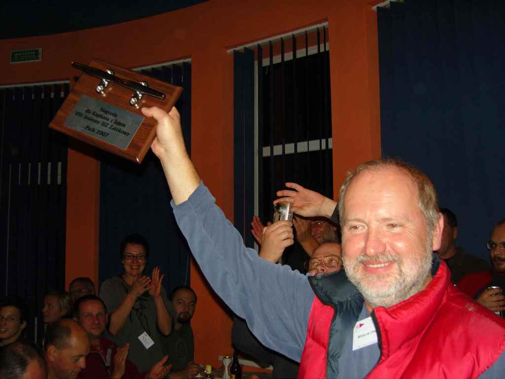 Kolejna atrakcja - kpt. Tomasz Chodnik wręcza swoja prywatna nagrodę Tomkowi Janiszewskiemu. Nagrodą są ... troki. Tak, tak - prawdziwe myśliwskie troki do zawieszania zdobyczy. Oficjalnie jest to (zasłużona!) nagroda za żeglarskie wyczyny "Tomjaniego", zwłaszcza na "wodach pływowych" (głównie nurt Wisły), ale przecież intencja nagrody jest tajemnicą poliszynela. Wszyscy wiedzą o przytroczenie jakiej zwierzyny "Tomjani" marzy..