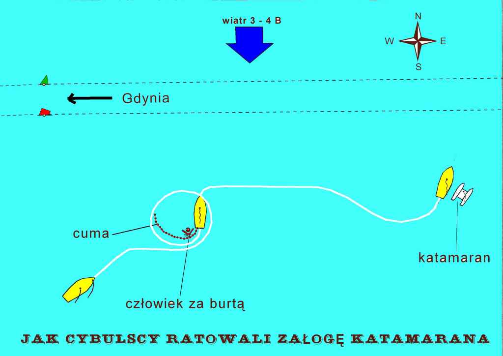 Po kilkunastu minutach byliśmy w pobliżu katamaranu. Był to chyba mały Hobie. Dryfujący żeglarz znajdował się między kadłubami pod siatką i trzymał się za przednią rurę łączącą kadłuby. Jacht dryfował z prędkością ok. 2 kn i woda wpychała żeglarza pod spód – nie miał siły aby wciągnąć się na siatkę. Podeszliśmy bliżej i gdy byliśmy burta w burtę niecały metr od siebie, pierwszy żeglarz przeskoczył z naszej burty na katamaran i pomógł drugiemu wydostać się z wody. Zrobiliśmy jeszcze dwa kółka w pobliżu, zapytałem czy potrzebują jakiejś pomocy, odrzekli że wszystko jest w porządku, zmienili hals i popłynęli w stronę Gdyni. My popłynęliśmy na Hel.