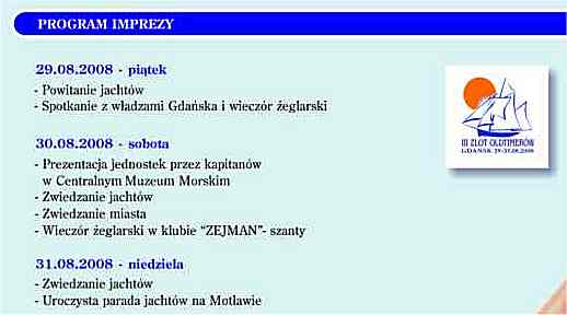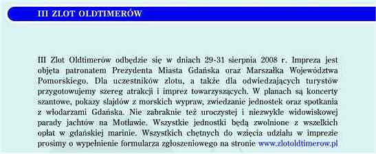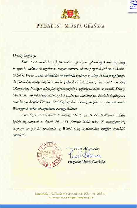 Za pośrednictwem Rafała Grada - szefa MARINY GDAŃSK dociera do nas zaproszenie na przyszłoroczny zlot oldtimerów, który odbędzie się oczywiście w stolicy polskiego żeglarstwa morskiego. Zeskanowałem co ciekawsze fragmenty tego zaproszenia. I co widzę - przecieram oczy. W Programie pan Prezydent zaprasza do ..... do ZEJMANA. Jak to mówił Mark Twain? Informacje o mojej smierci okazały się nieco przesadzone (cytat z pamieci, moze nie dokładny). Niektórzy Czytelnicy tego newsa zauważą z przekasem - ten Don Jorge nie przepuści zadnej okazji aby absolutnie z każdego wystapienia władz nie zrobic sobie przynajmniej jednego jaja. Drodzy Czytelnicy - gdybym był inny, to byście do tego okienka tak licznie nie zaglądali. No nie ?
